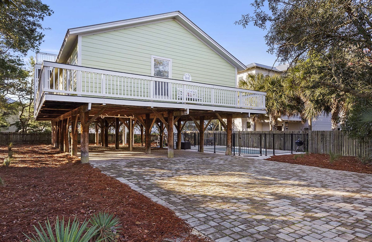 A South Walton vacation is all about relaxing in a beautiful coastal oasis. Dune Betty is a beach vacation rental in Gulfview Heights in Santa Rosa Beach that helps you achieve just that! This coastal-inspired beach home is raised on stilts with a complete wraparound balcony, an elevated sun deck, and best of all, a heated private pool! With three bedrooms and two full baths, this charming beach home can host up to eight 30A vacationers.