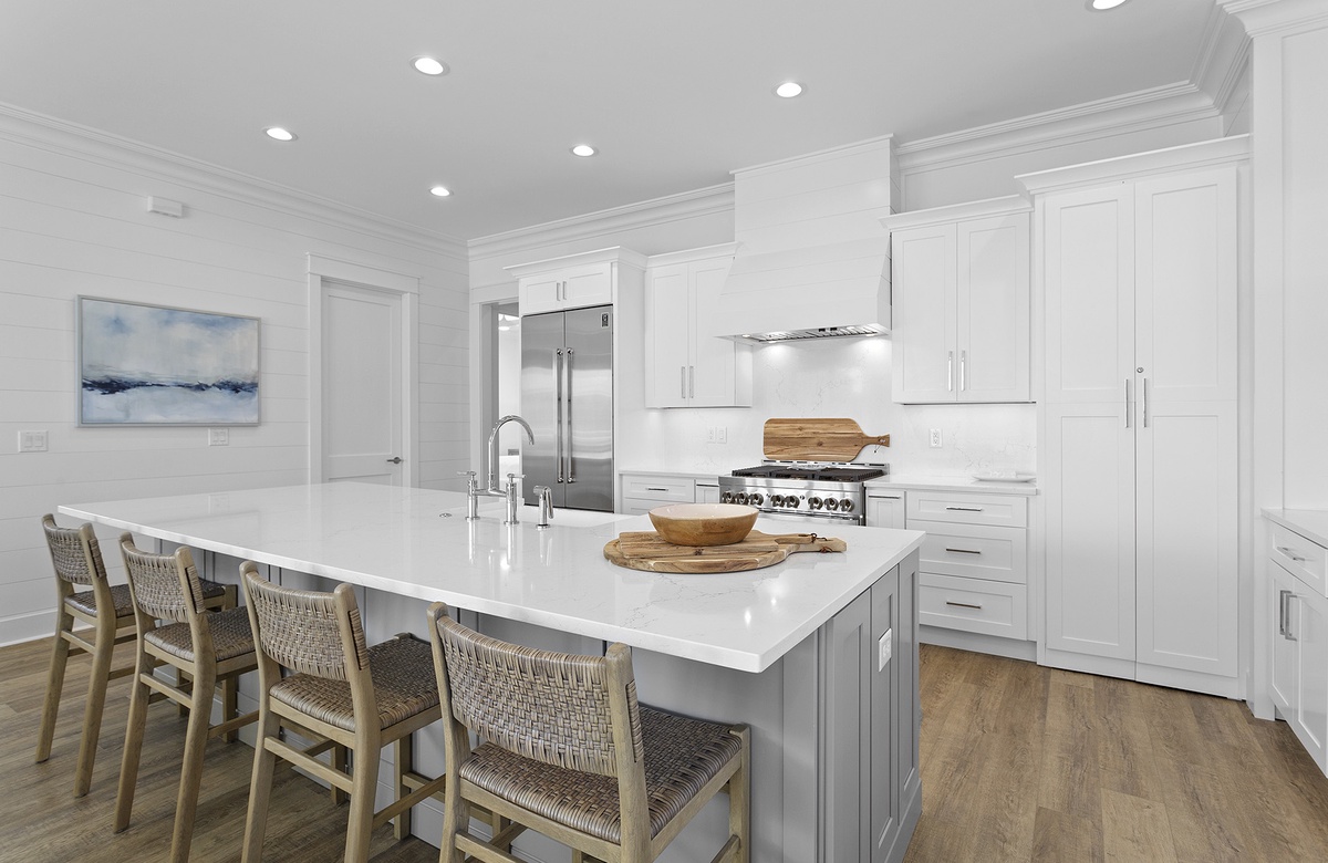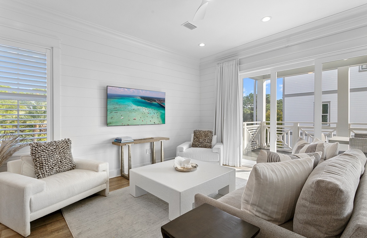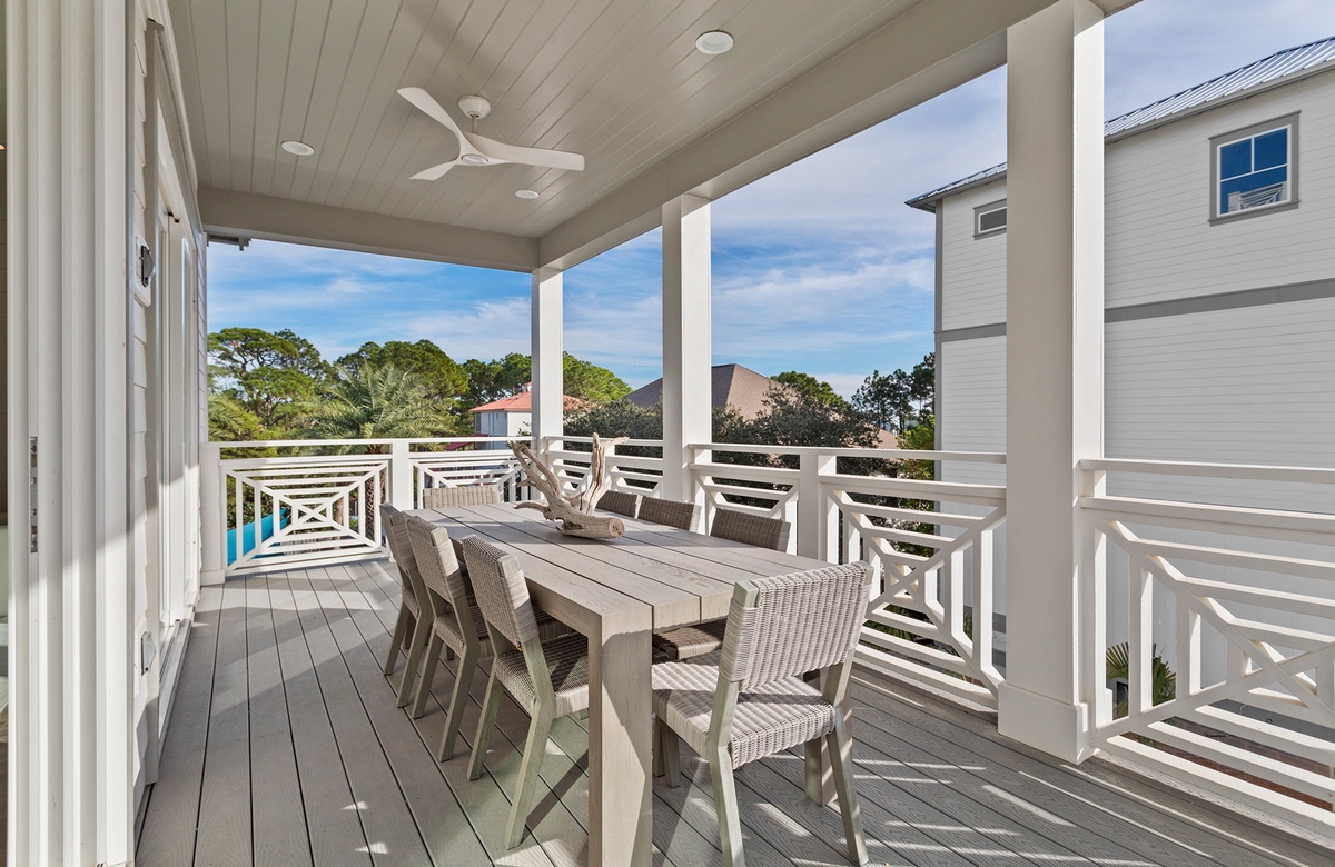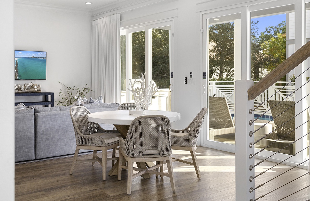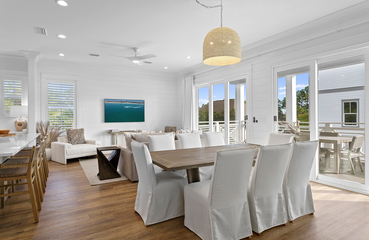 Ascend the stairs to the second level, where the main great room is located. The space features shiplap walls, wood flooring, white and neutral furnishings, wicker décor, and natural sunlight—all of which combine to create a laidback and cozy atmosphere. The living room includes a gray couch and two oversized white armchairs. This seating ensemble is situated around a large coffee table and faces a wall-mounted TV. Honey-toned floors flow into the open dining area, where eight slip-covered chairs surround a hardwood table. Four additional seats can be found at the spacious kitchen island, which allows for easy dining and serving everything from meals to mixed drinks. The well-appointed kitchen is a dream, featuring white cabinetry, plenty of counter space, and stainless-steel appliances. In addition to being a great gathering space, the great room provides access to a covered balcony that overlooks the pool. Here, a full outdoor dining table and seating for eight provides an ideal place for alfresco dining.