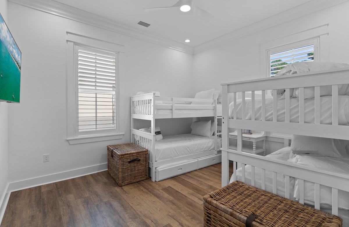 The guest bedrooms are equally as comfortable as the primary suite, and three include king-size beds. On the first floor, there is one guest room with a king-size bed, TV, and a shared bath. The second floor includes one guest bedroom with a king-size bed and one guest bunkroom with two twin bunks and two twin trundles. The bunkroom is a great option for the kids in the group. The final guest bedroom is on the third floor. It has a king-size bed, TV, and private bath with a soaking tub and walk-in shower.