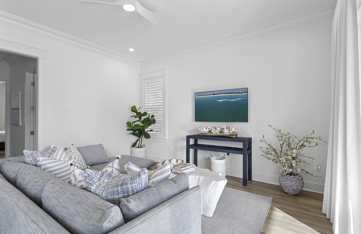 You'll know you've made the right choice as soon as you pull up to this stunning property. A landscaped lawn and the home's exterior colors of white and gray radiate a calm ambiance that eases you into a vacation frame of mind. Step inside, and the first floor greets you with a lovely den and access to the pool patio. The den includes a plush wraparound couch and a white cocktail table that faces a wall-mounted TV. A round table provides a place for casual dining, drinks, or playing games. Two sets of glass doors open directly onto a covered patio and private pool deck. Lounge chairs and a gas grill make it the perfect area to sit back and relax with your fellow beachgoers.