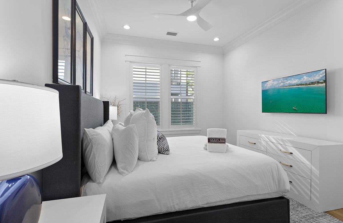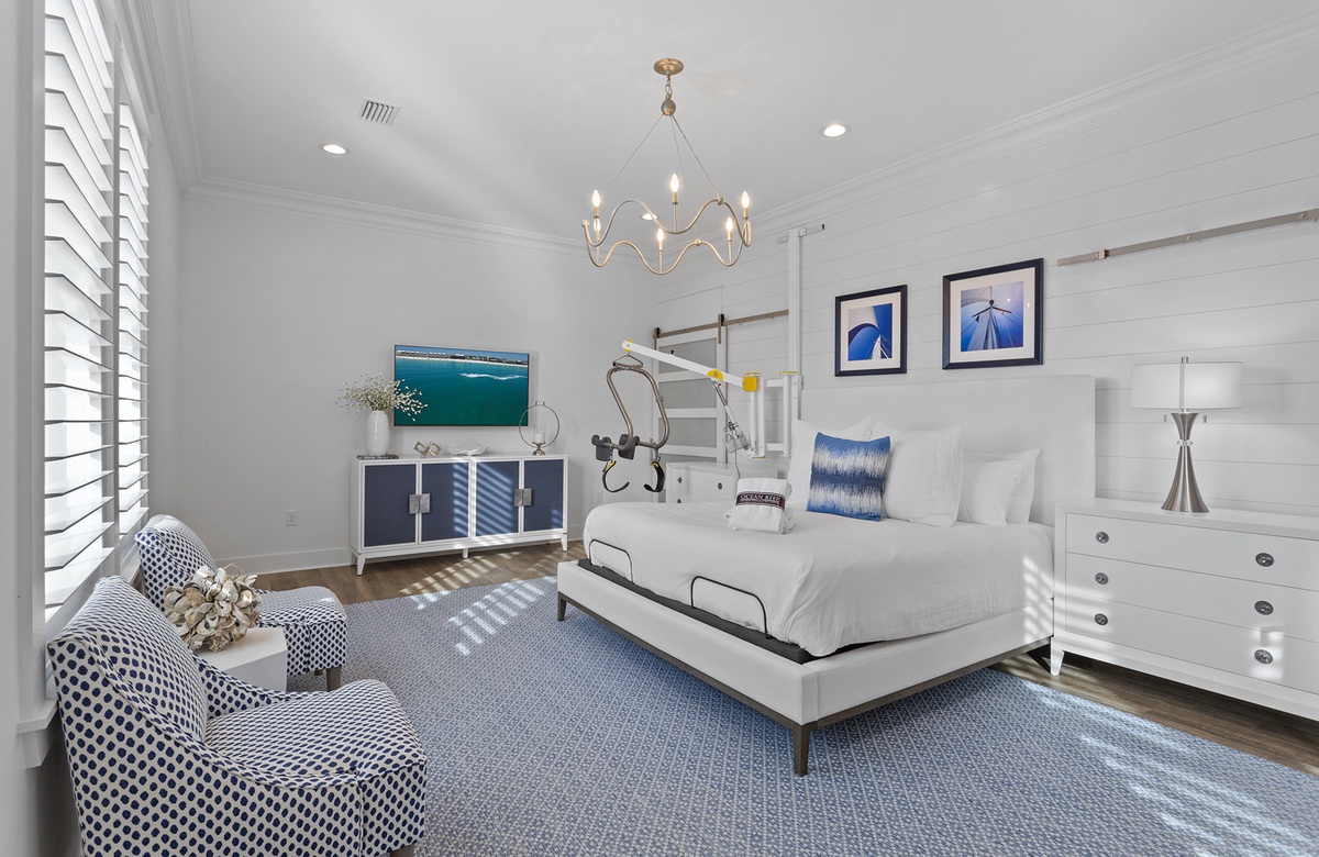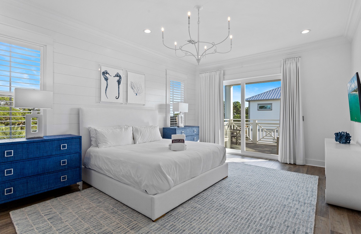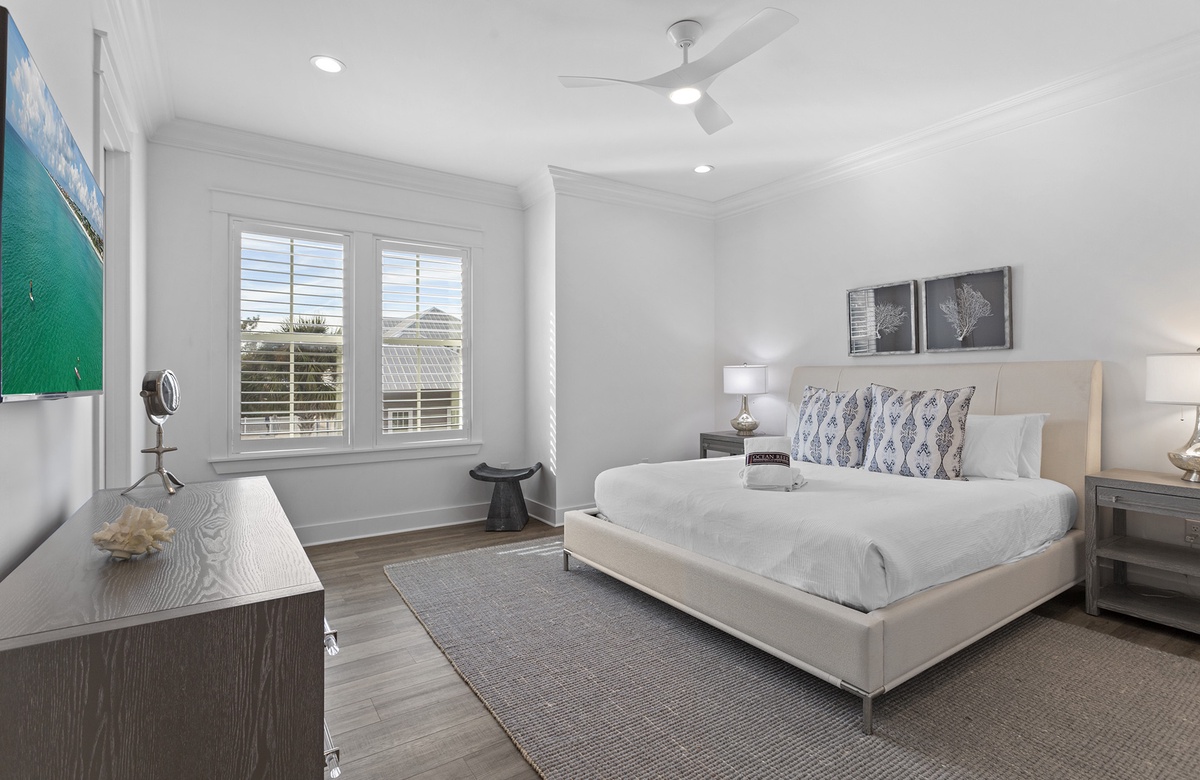 When it comes to sleeping accommodations, nothing compares to this lovely home. The five bedrooms are spread across each of the home's three levels. The primary bedroom is located on the third floor. It has a king-size bed, flatscreen TV, and balcony access. With shiplap walls, blue accent furniture, and sea-inspired décor, it truly gives off peaceful coastal energy. The private ensuite bath is magnificent, with a soaking tub, double vanity, and walk-in shower.