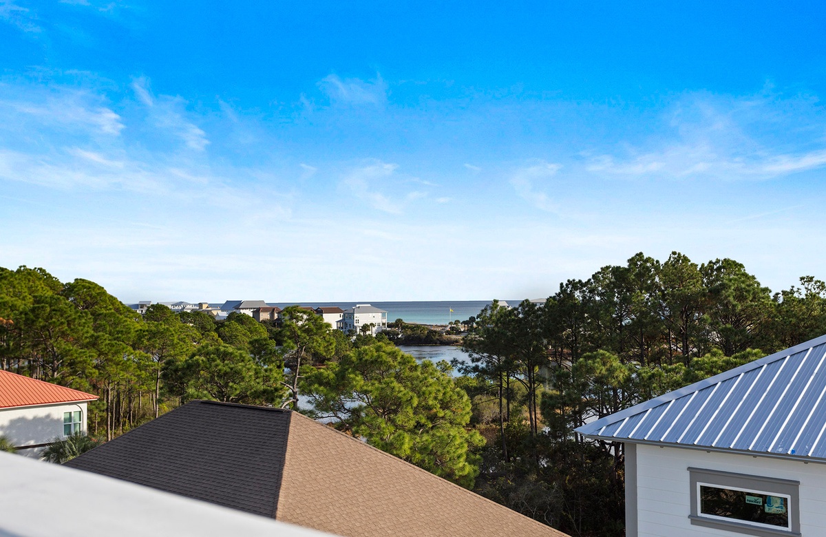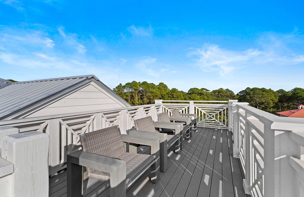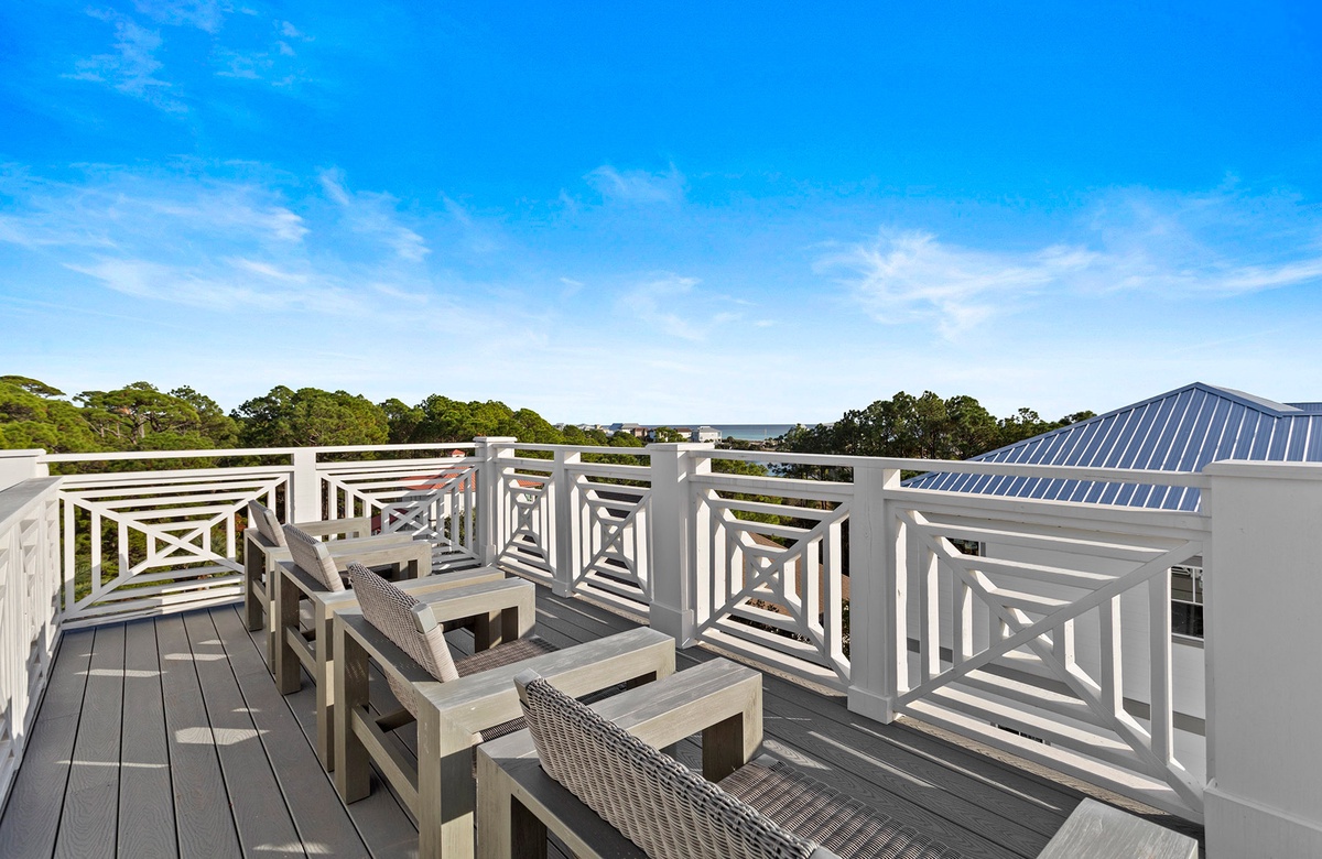 Aside from the home's covered balconies, guests can also enjoy incredible views of a coastal dune lake and the Gulf from the rooftop observation deck. To reach the deck, take the spiral stairs from the third-floor balcony. The deck includes several viewing chairs.