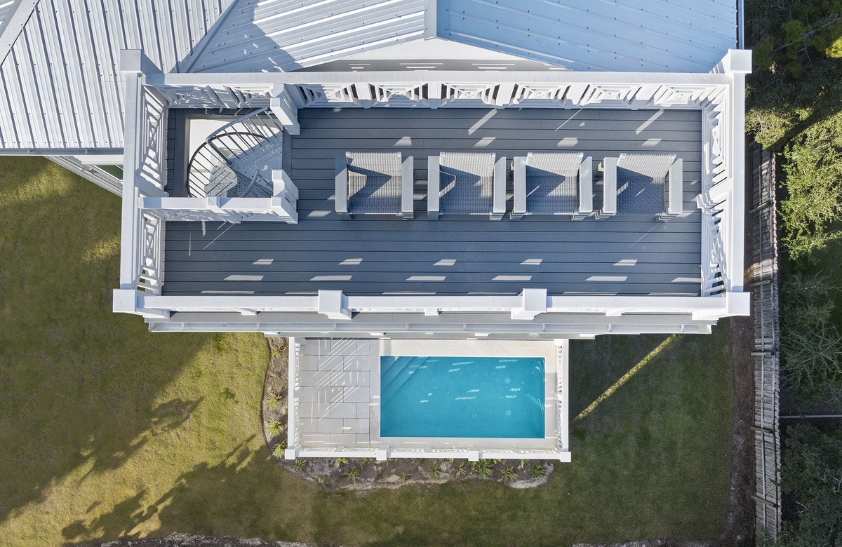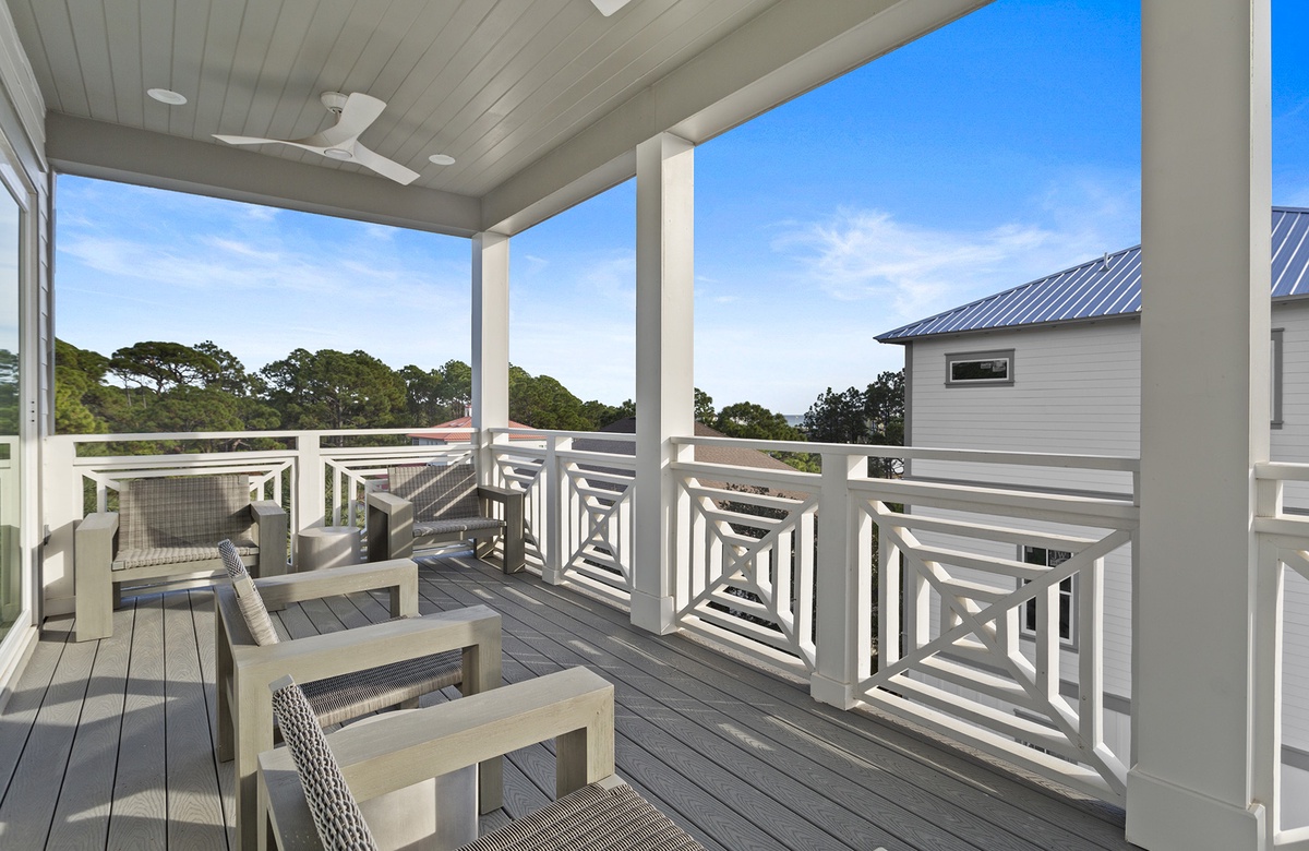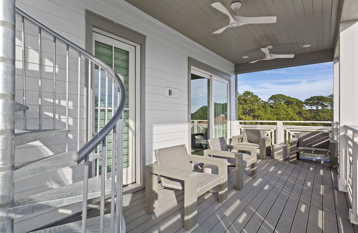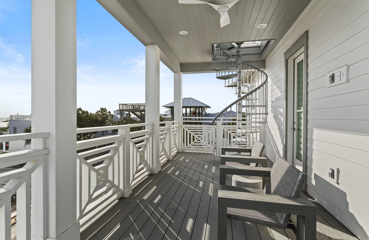 Aside from the home's covered balconies, guests can also enjoy incredible views of a coastal dune lake and the Gulf from the rooftop observation deck. To reach the deck, take the spiral stairs from the third-floor balcony. The deck includes several viewing chairs.