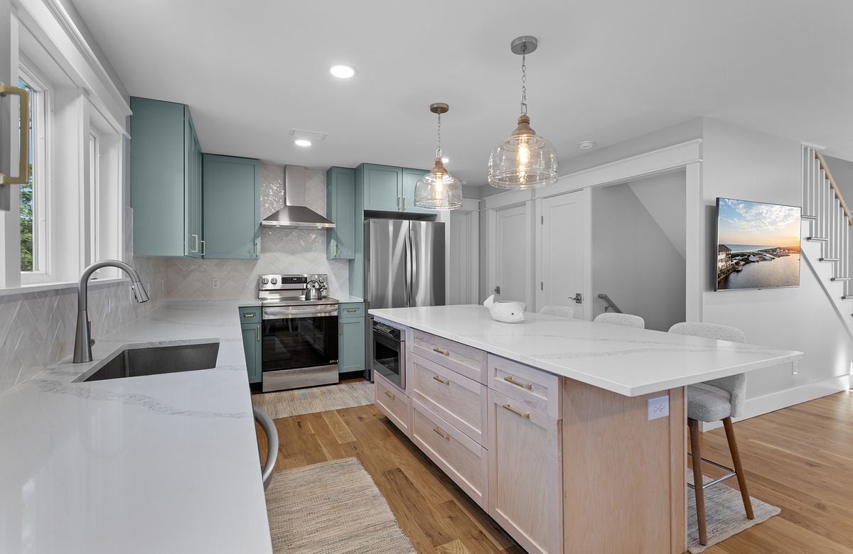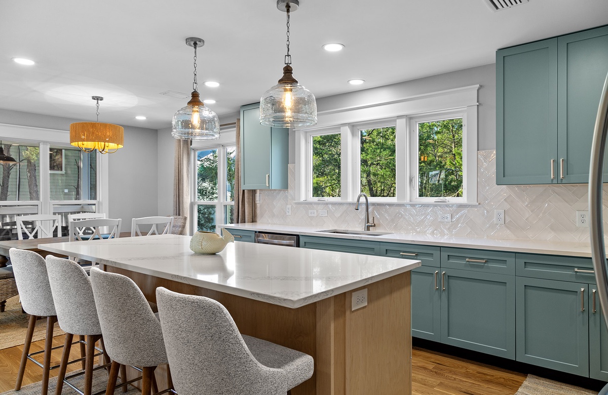 Inside, the open-concept living space is bathed in natural light, with high end finishes, stylish furnishings, and coastal-chic décor. A wraparound dove-gray couch and regal accent chair provide a cozy spot for gathering in the living area, where a large wall-mounted flatscreen TV invites movie nights and unwinding after a sun-soaked day. The dining space features a mix of cottage-style and woven chairs around a sleek modern table, perfect for shared meals. The chef's kitchen boasts custom light teal cabinetry, quartz countertops, a glass-brick backsplash, and brushed stainless steel appliances, including a French-style refrigerator, making meal prep effortless. Multiple covered verandas and a screened-in porch provide shaded outdoor seating for morning coffee, evening cocktails, or alfresco dining.