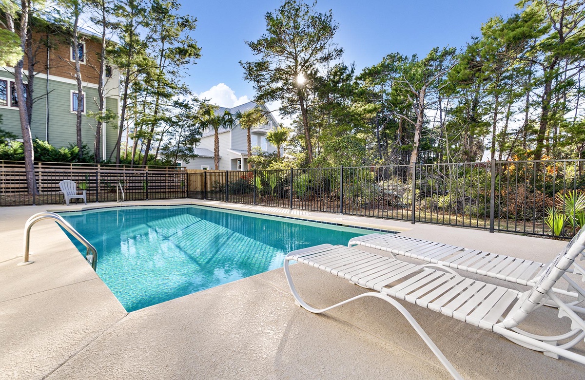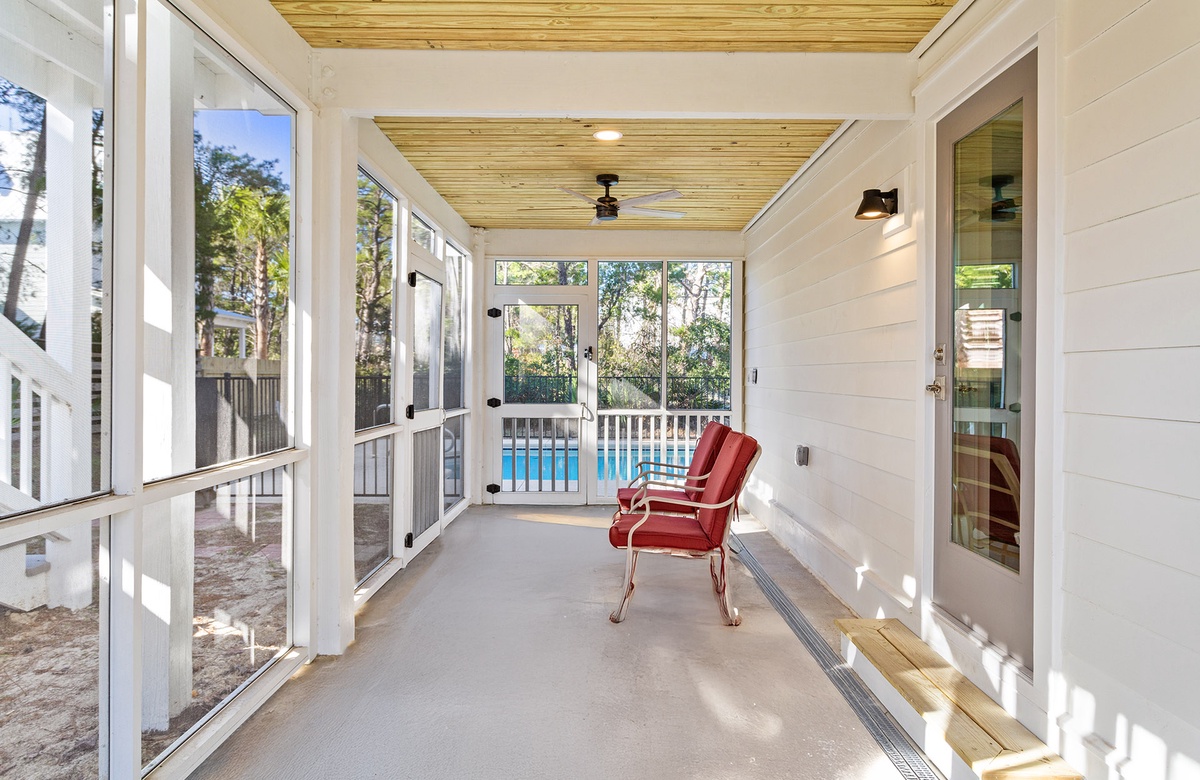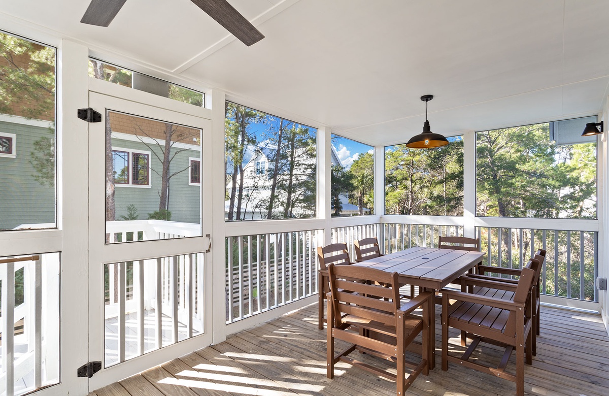 Step outside to discover your own private backyard oasis. The sparkling swimming pool, illuminated beautifully at night, provides the perfect escape after a day at the beach. A screened-in porch and two covered verandas offer shaded spots to relax, whether you're reading a book, sipping a cocktail, or enjoying the Gulf breeze. Fire up the gas grill for a poolside cookout—the perfect way to end a sun-drenched day along 30A.