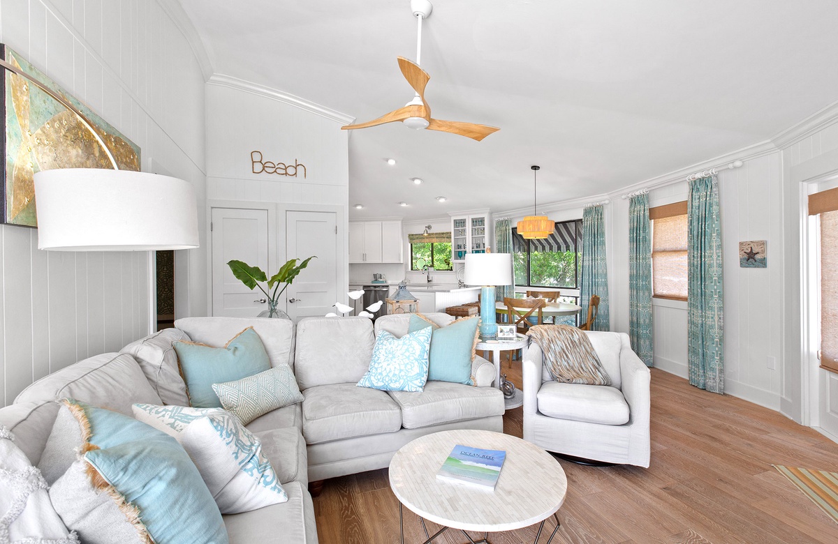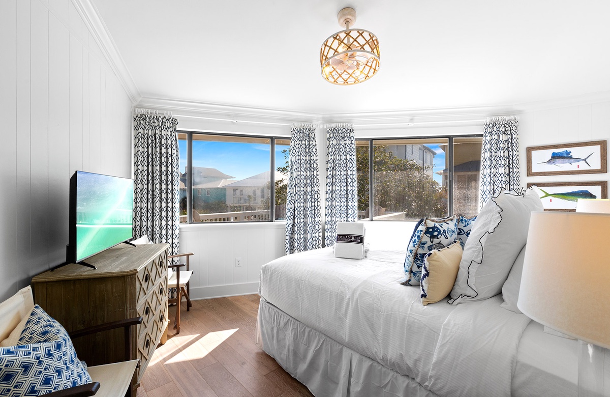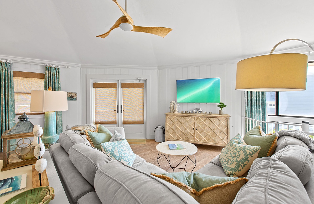 The first floor includes a relaxed family room with a queen sleeper sofa, daybed nook, flatscreen TV, and a chic wet bar with beverage cooler and wine storage. A king guest bedroom and full bath with a walk-in shower are also located on this level. Ascend the spiral staircase to the sun-filled second floor, where walls of windows frame tropical views and open concept living, dining, and kitchen spaces create the perfect backdrop for gathering. Step outside onto the breezy wraparound sundeck with lounge seating and alfresco dining areas.