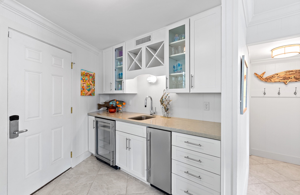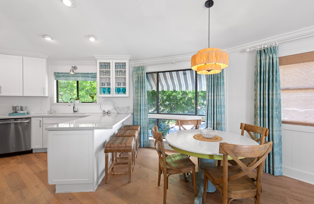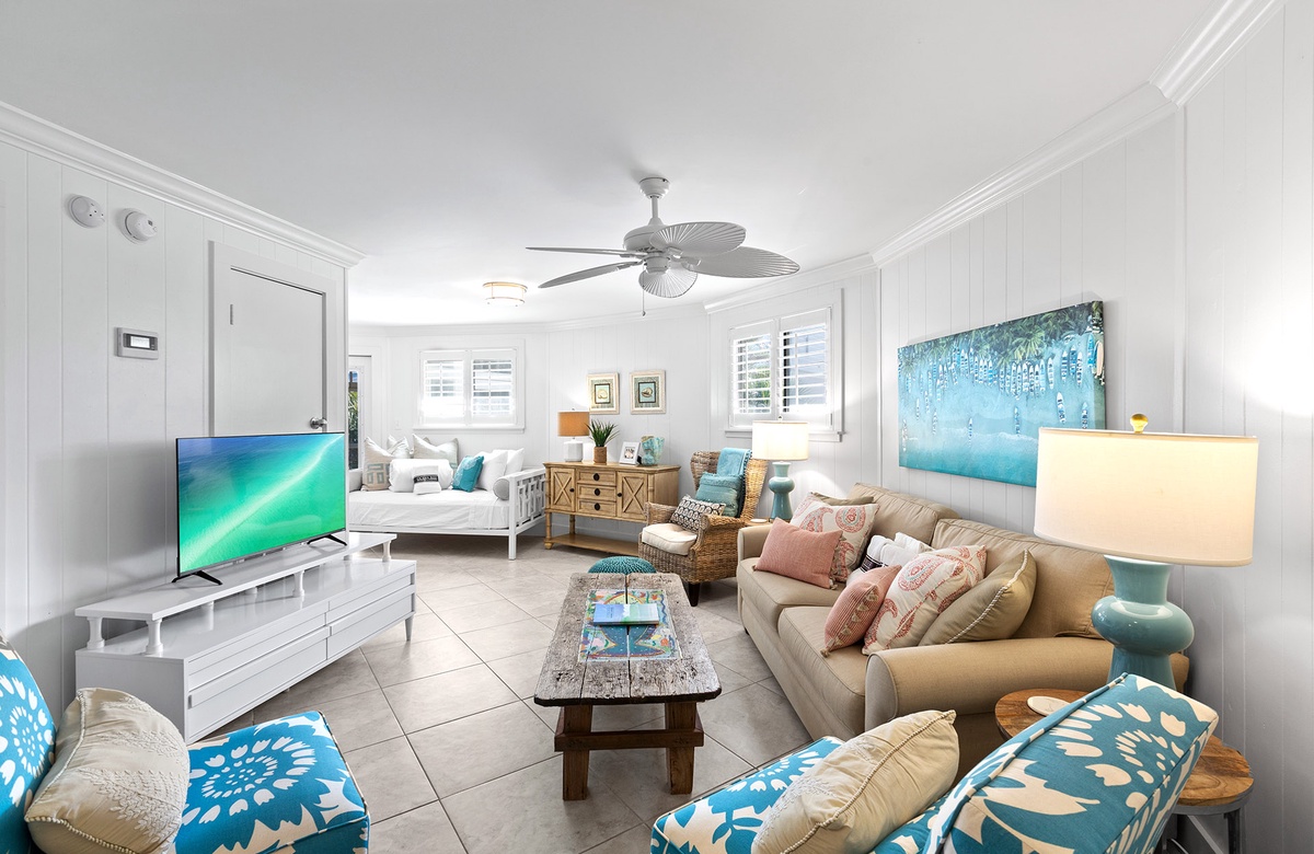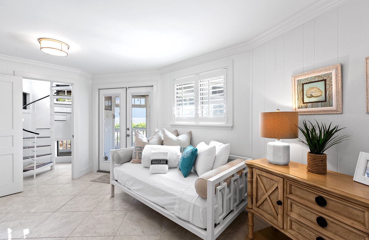The first floor includes a relaxed family room with a queen sleeper sofa, daybed nook, flatscreen TV, and a chic wet bar with beverage cooler and wine storage. A king guest bedroom and full bath with a walk-in shower are also located on this level. Ascend the spiral staircase to the sun-filled second floor, where walls of windows frame tropical views and open concept living, dining, and kitchen spaces create the perfect backdrop for gathering. Step outside onto the breezy wraparound sundeck with lounge seating and alfresco dining areas.