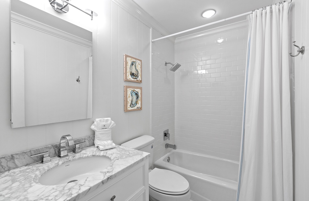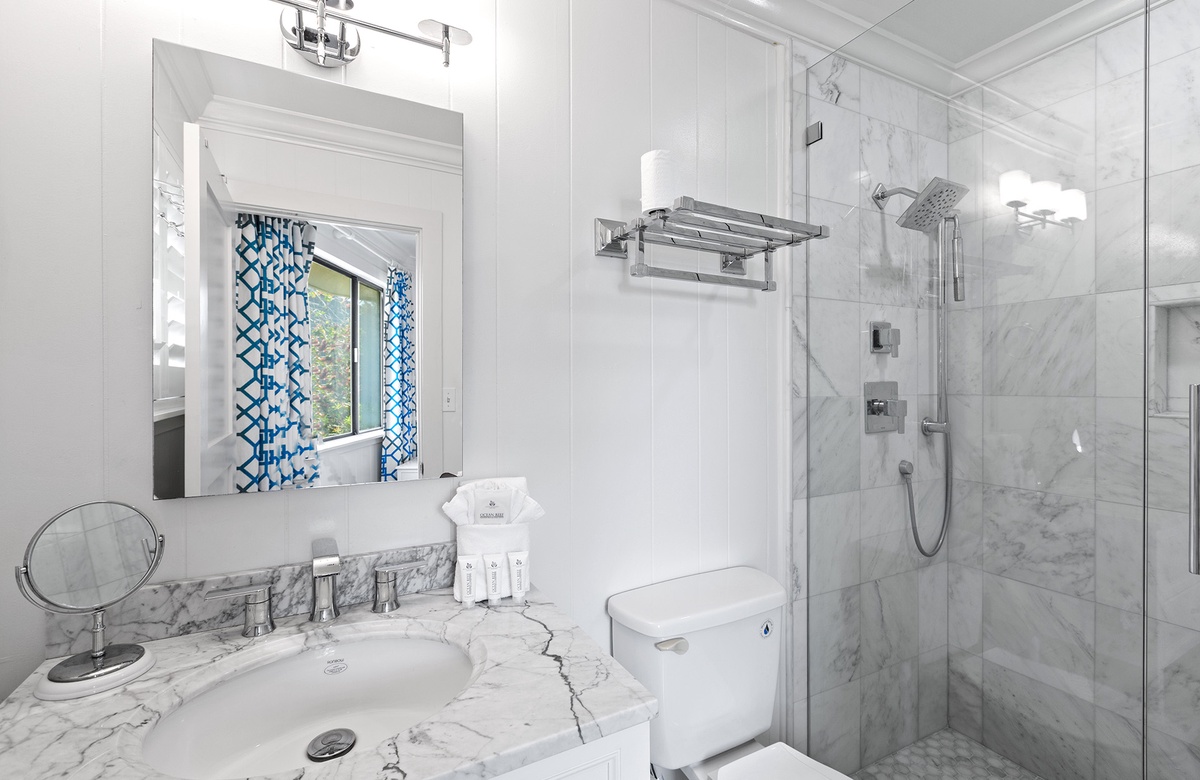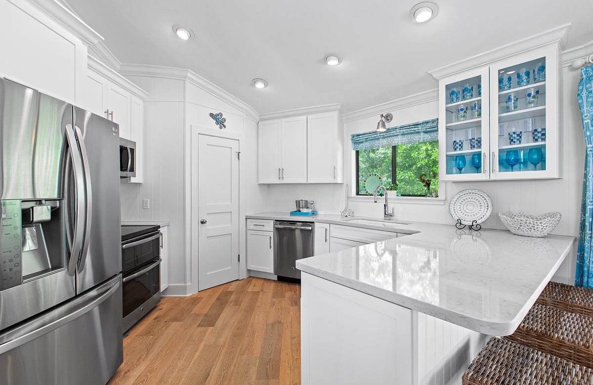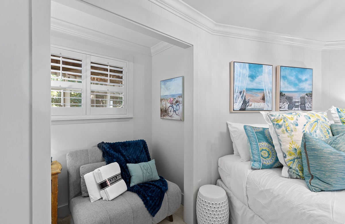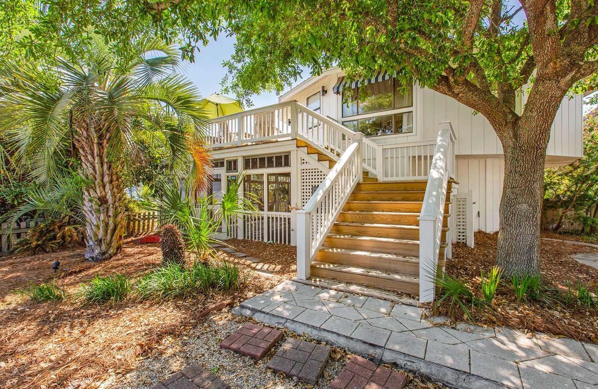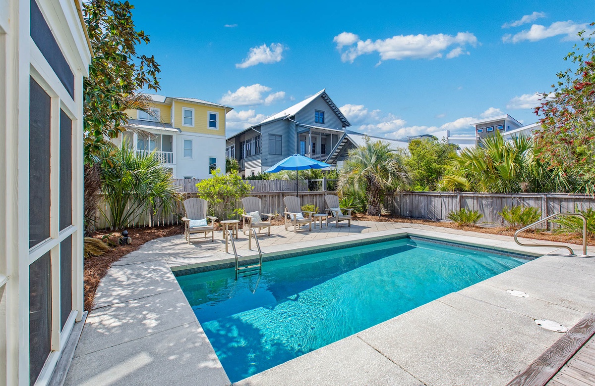 Upstairs, the king primary suite includes a private ensuite bath with a sleek walk-in shower, while a nearby queen guest bedroom offers access to a full hall bath. Custom cabinetry, stainless steel appliances, and coastal-chic furnishings complete the elevated yet relaxed aesthetic. And outside, your private pool is surrounded by palms, a screened porch, a shaded dining space, and a grill—perfect for laid-back cookouts or post-beach lounging.