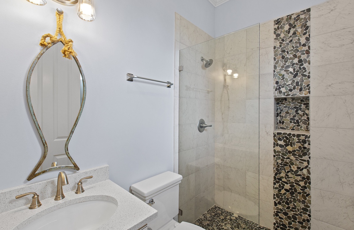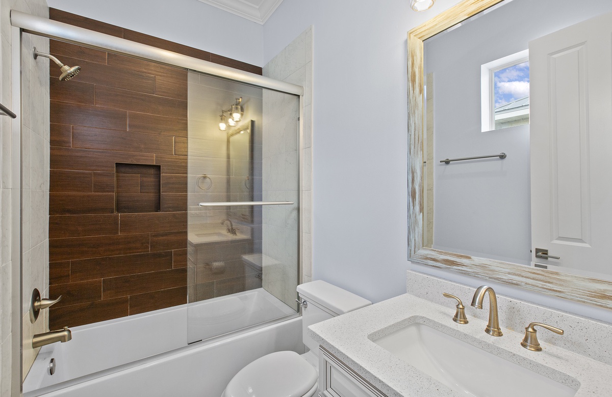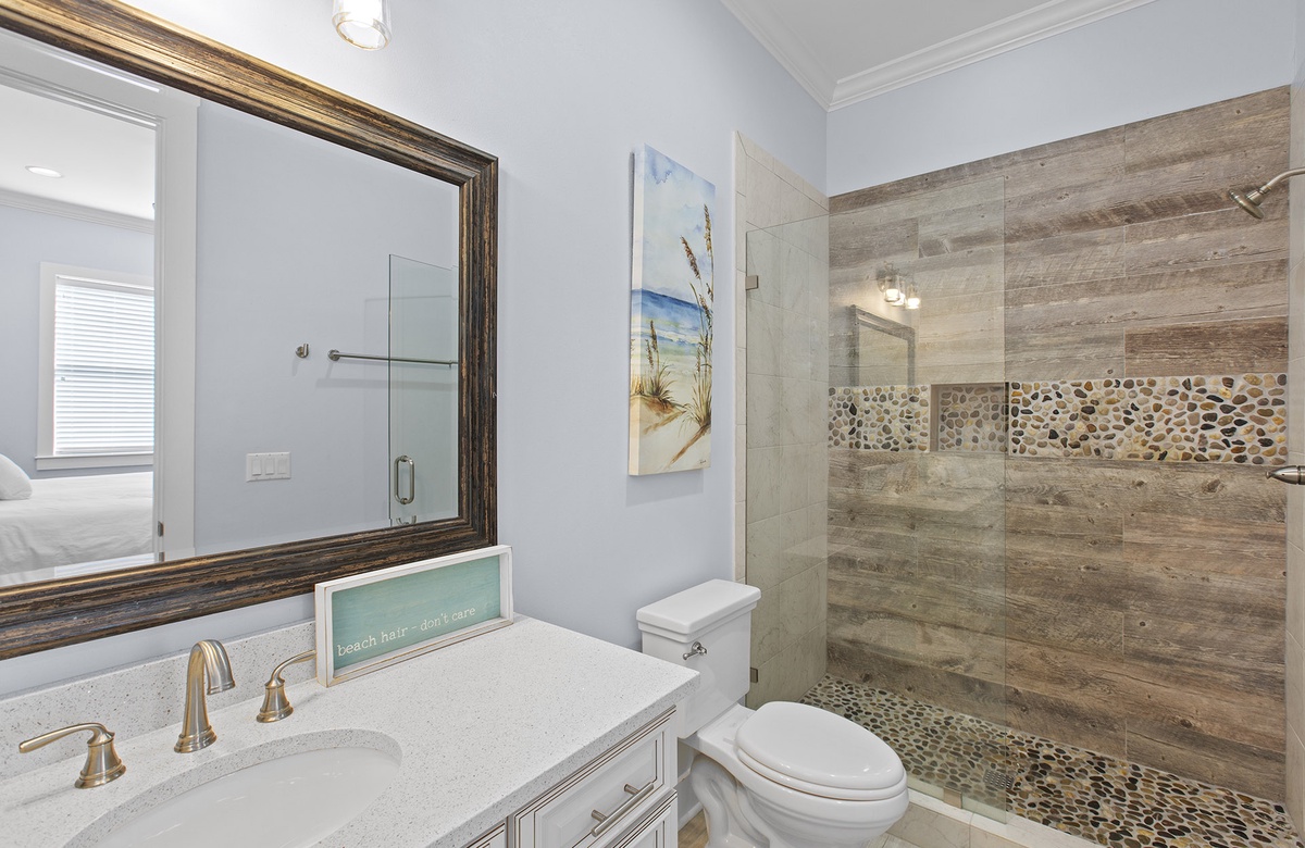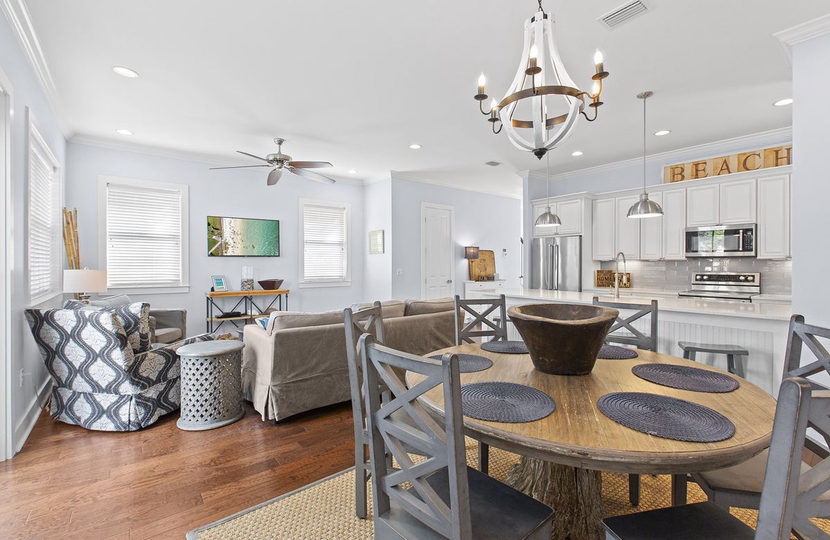 Gone Coastal is a brand new vacation rental located just off of 30A in Dune Allen Beach. This beautiful two story beach house comes equipped with 4 bedrooms, 4.5 bathrooms, and can accommodate up to 11 lucky guests. The first floor has your main living area which is spacious and opens up into the dining room and the modern updated kitchen. The first floor also has one of the bedrooms with access to a full bathroom. You will find a staircase that leads up to the other three bedrooms. The Master Bedroom features a King Size bed and a full en suite bathroom and it also has its own private balcony. Another guest bedroom also contains a King Size bed. The fourth guest bedroom has a Queen Size bed and you will find a bunk room at the top of the stairs that has a sliding barn door entrance with a two sets of bunk beds perfect for the kids.