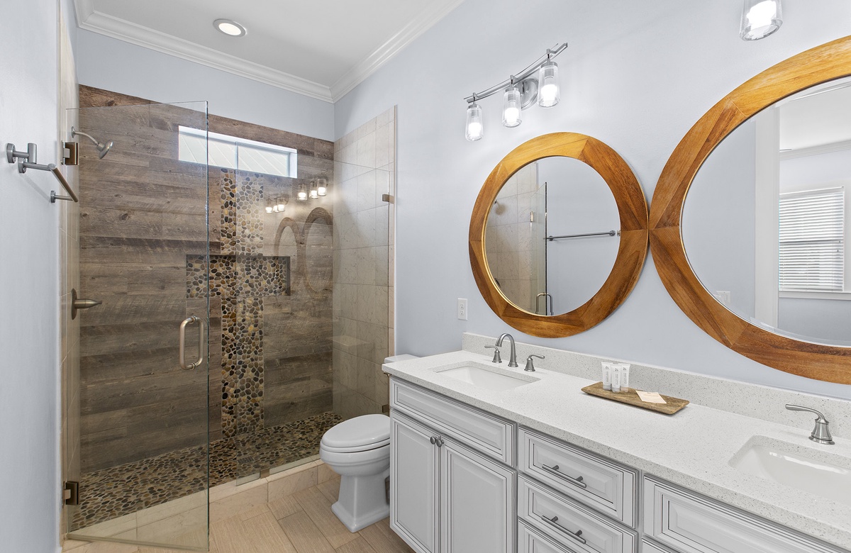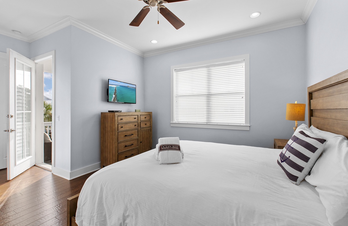 Second Floor: King Master Suite with Walk-In Shower and Balcony Access, Queen Bedroom with Full Bath and Tub/Shower Combo, Bunk Room with Full/Twin Bunk + Twin Bunk and Walk-In Shower.