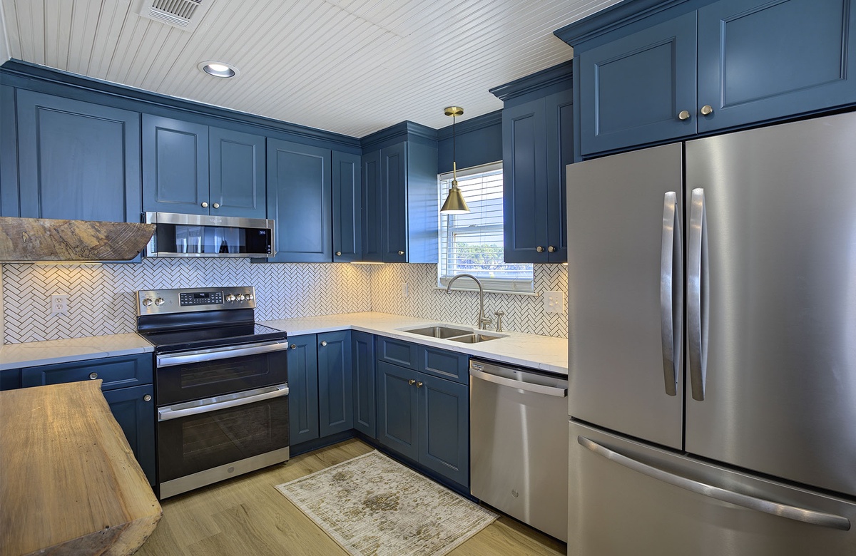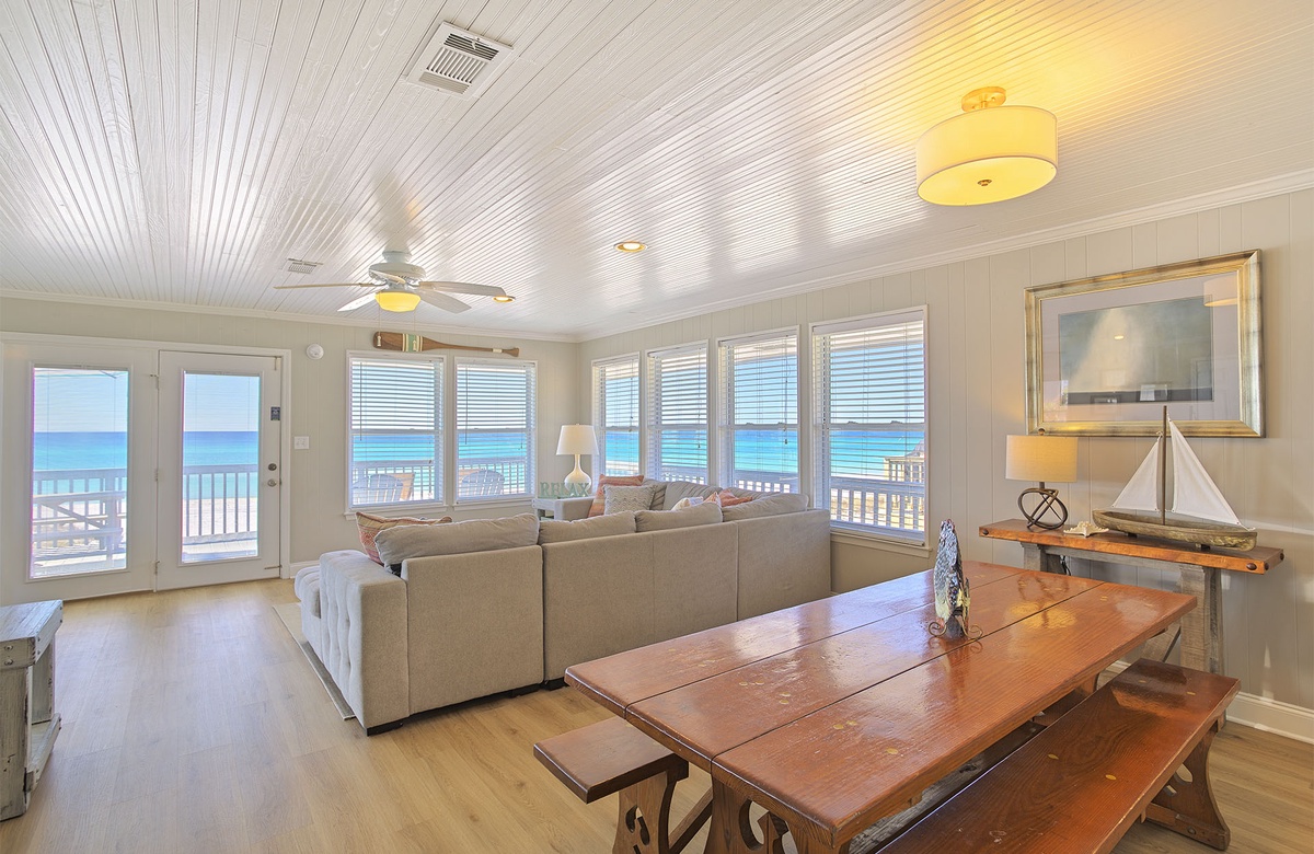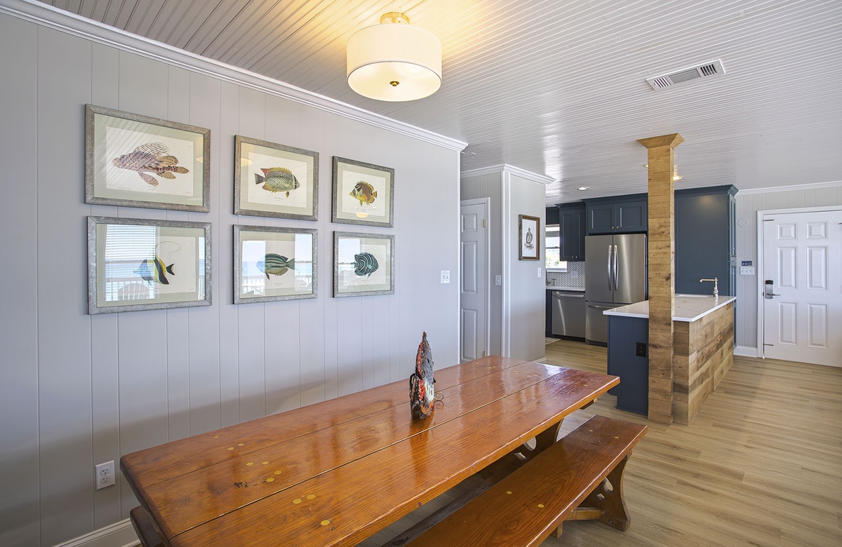 Glass windows and doors surround the open floorplan, making the living area seem even brighter and more welcoming. On one side of the living room, there is a wraparound couch, tropical accent chair, patterned rug, and rustic coffee table. The other side features a beige cushioned couch that converts to a queen sleeper sofa and a flatscreen TV. The glass doors ensure beach vistas fill the living room all day long, so you won’t ever forget that you’re on vacation! Outside, the deck includes lounge chairs, a picnic table, and a grill. It’s the perfect place to enjoy the salty air, sea breezes, coastal sounds, and the casual company of your fellow vacationers. Back indoors, the vinyl floor flows gracefully from the living room into the dining area. The dining room has a honey-toned hardwood table with bench seating. The adjacent kitchen features quality appliances, quartz countertops, and plenty of cabinet space.