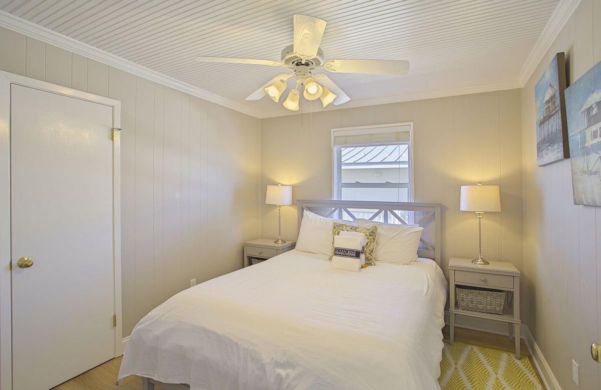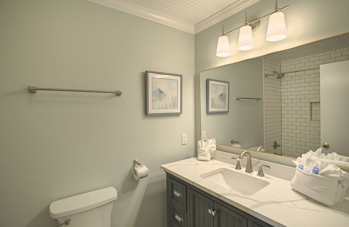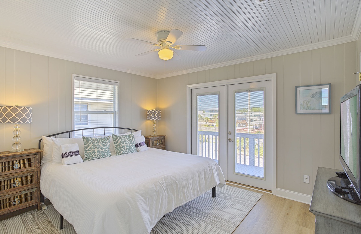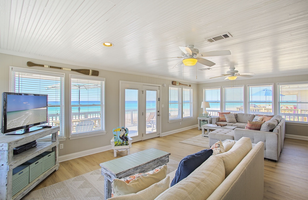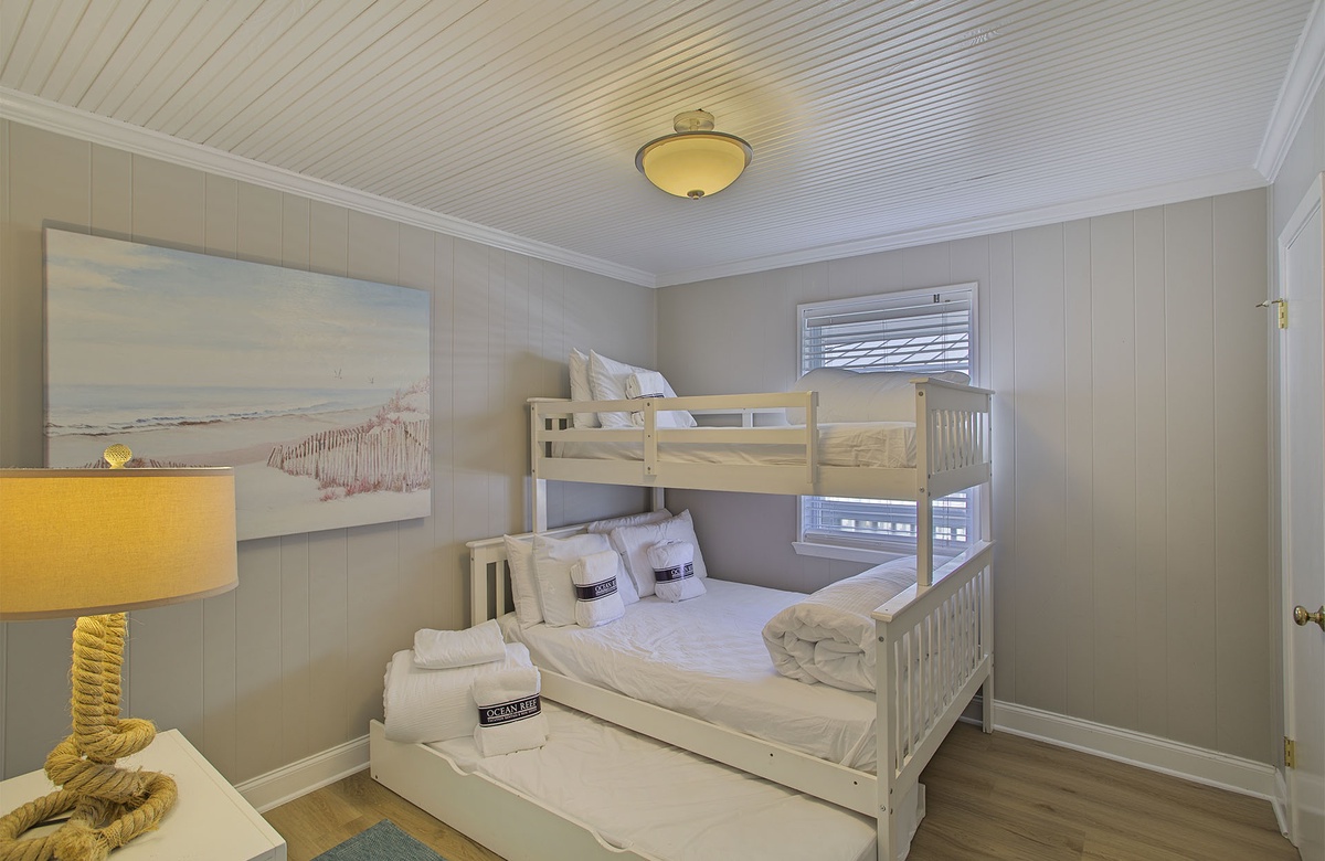 The home’s master suite boasts a king-size bed, TV, coastal art, private balcony access, and an en-suite bath with a walk-in shower. Another guest bedroom also has a king-size bed, TV, and access to the wraparound balcony. One guest bedroom has a queen-size bed, and the final bedroom is a bunkroom with a full/twin bunk and twin trundle bed. The guest bedrooms share access to a full hall bath.