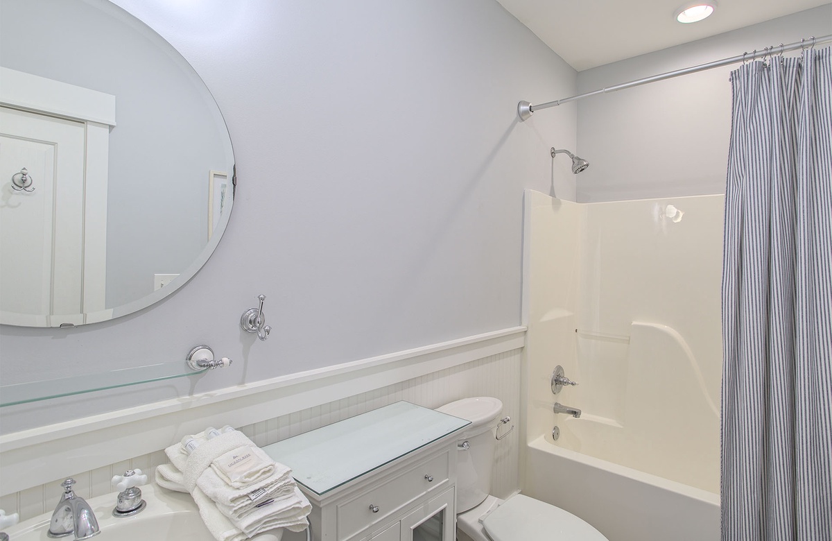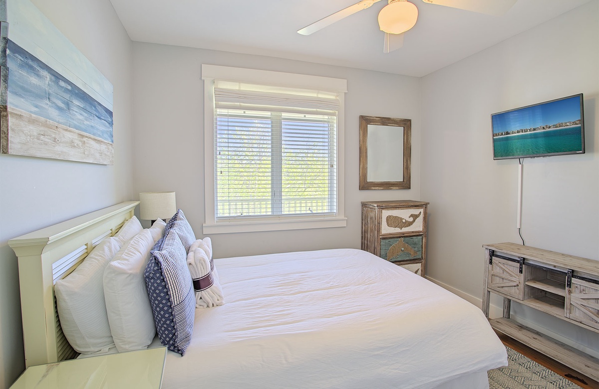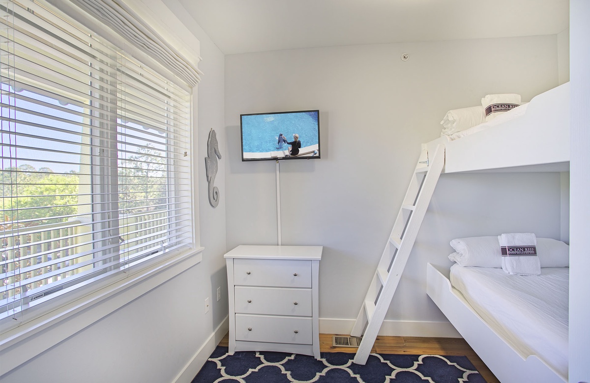 The condo’s master suite boasts a king-size bed, tufted headboard, woven dresser, and white bedside tables. A wall-mounted TV is provided for evening entertainment. Glass doors lead to the balcony. The master suite also has a nautical-inspired ensuite bath with a glass-walled walk-in shower. One of the sunny guest suites includes a queen-size bed and beach-washed furnishings. The other guest bedroom is great for the kids, as it has a twin bunk and TV. The two guest bedrooms share access to a full hall bath.