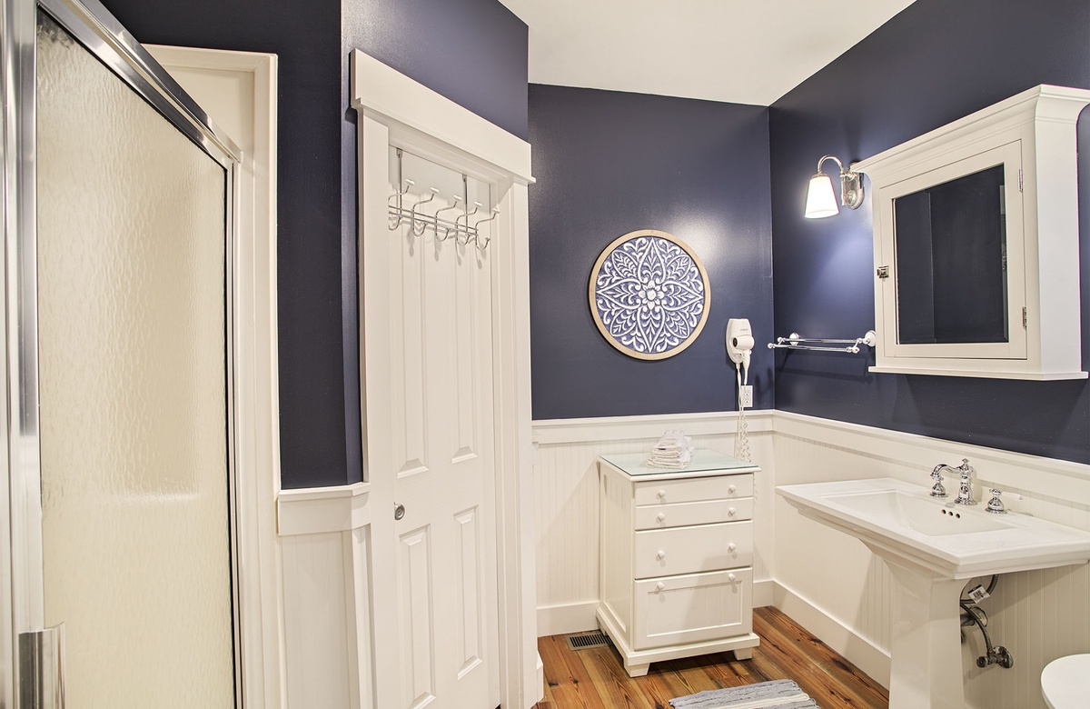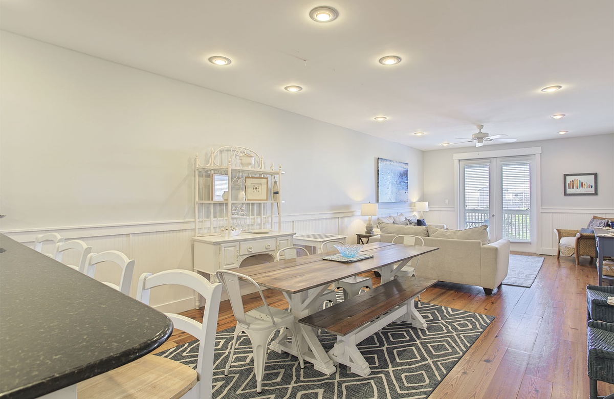 Hardwood floors, modern appointments, and coastal-inspired décor create a relaxed environment for all visitors. The living room includes a cream-colored sleeper sofa, matching loveseat, and woven accent chair. The cozy seating ensemble centers around a glass-topped drink table and nautical-blue rug. One couch conveniently doubles as a queen-sized sleeper sofa for additional bedding if needed. Half shiplap walls and an abstract blue painting above the couch give off beach vibes. A wall-mounted TV above a gray entertainment shelf completes the space. A set of glass doors open onto a breezy patio furnished with Adirondack chairs and a café table. It’s the ideal spot to enjoy the picture-perfect Gulf Coast weather. Inside, the dining room is adjacent to the living area. Here, a farmhouse table with bench seating and four chairs sit atop a gray geometric rug. Four additional raised chairs are located at the kitchen’s granite-topped breakfast bar nearby. The kitchen includes white cabinetry and stainless steel appliances.