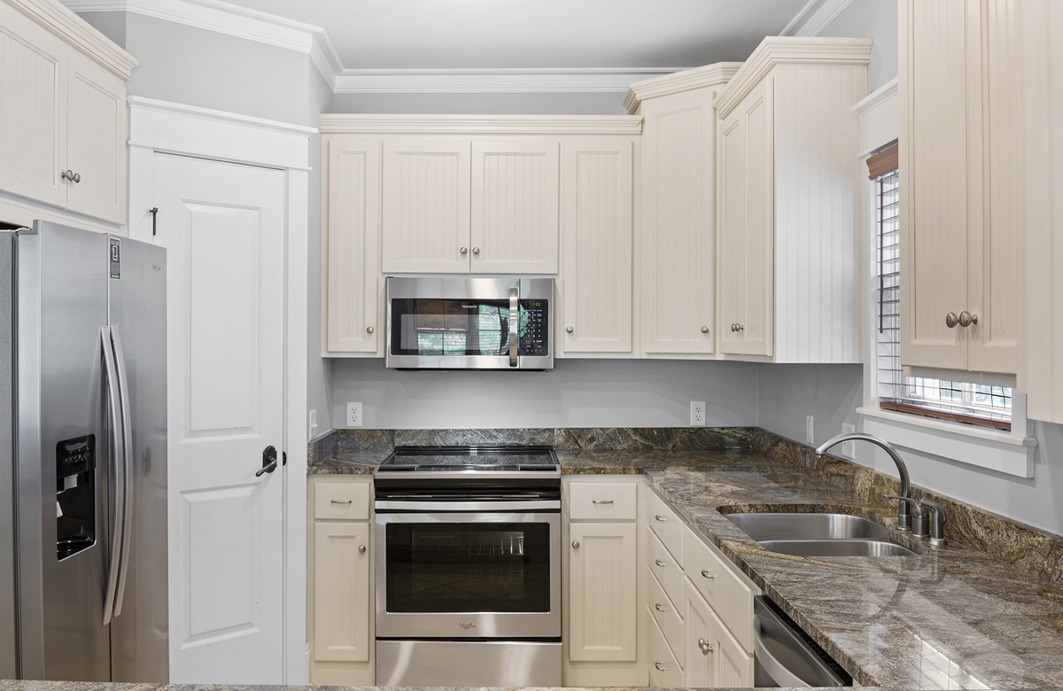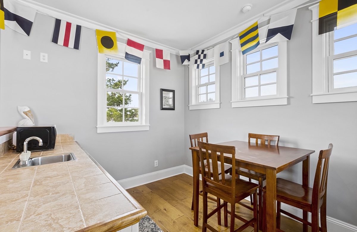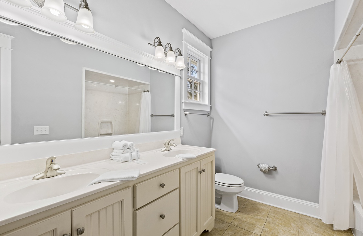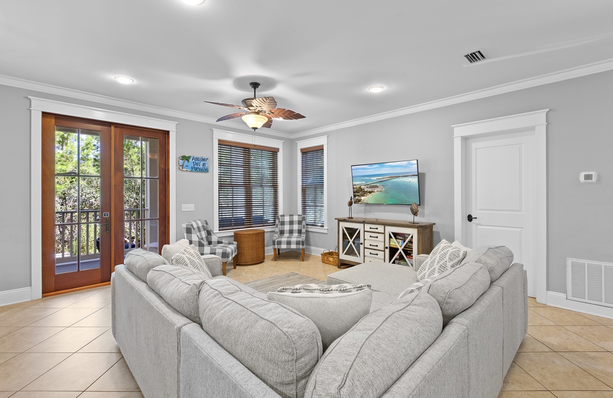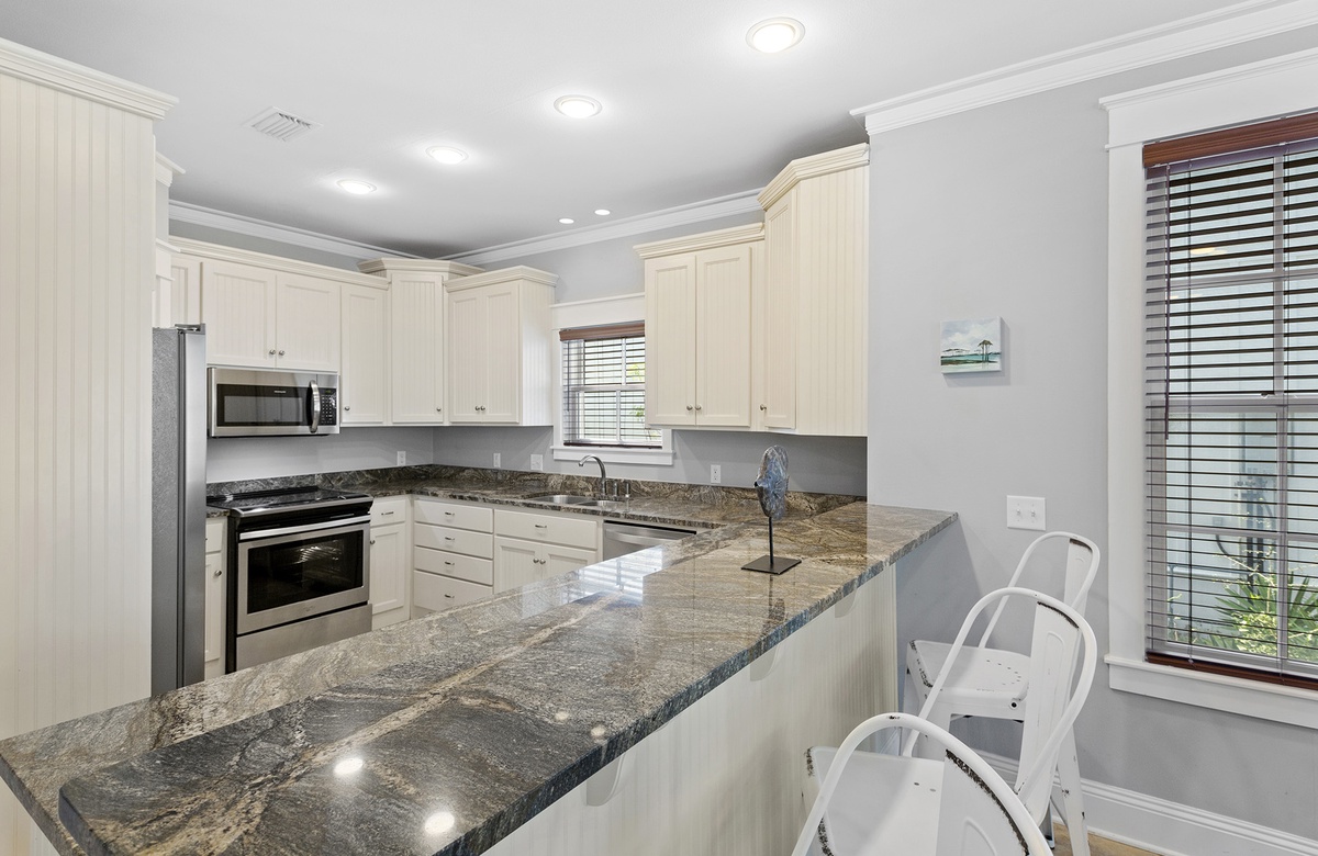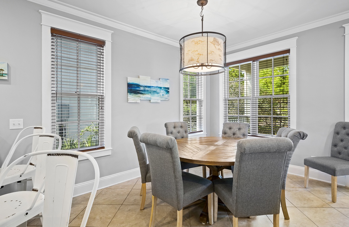 A picture-perfect southern front porch greets you upon arrival. From here, you and your guests can sip ice-cold drinks while enjoying each other’s company and cool breezes. Inside on the first floor, you will find the main great room, which encompasses the living, kitchen, and dining areas. Parchment-toned tile flows throughout the space, while large windows filter in lots of warm sunlight. The living room includes a wraparound couch and two accent chairs. The seating ensemble faces a flatscreen TV mounted above a two-toned entertainment cabinet. Nearby, a round table and six gray chairs sit beside multiple windows, creating a relaxing dining setting. The kitchen overlooks the dining area, and the raised breakfast bar provides additional stool seating. Sleek countertops, spacious cabinets, and stainless-steel appliances make it easy to serve up vacation meals no matter the time of day. You can also access a laidback porch from this main great room. It is furnished with white Adirondack chairs, outdoor tables, a BBQ grill, and a bubbling hot tub.