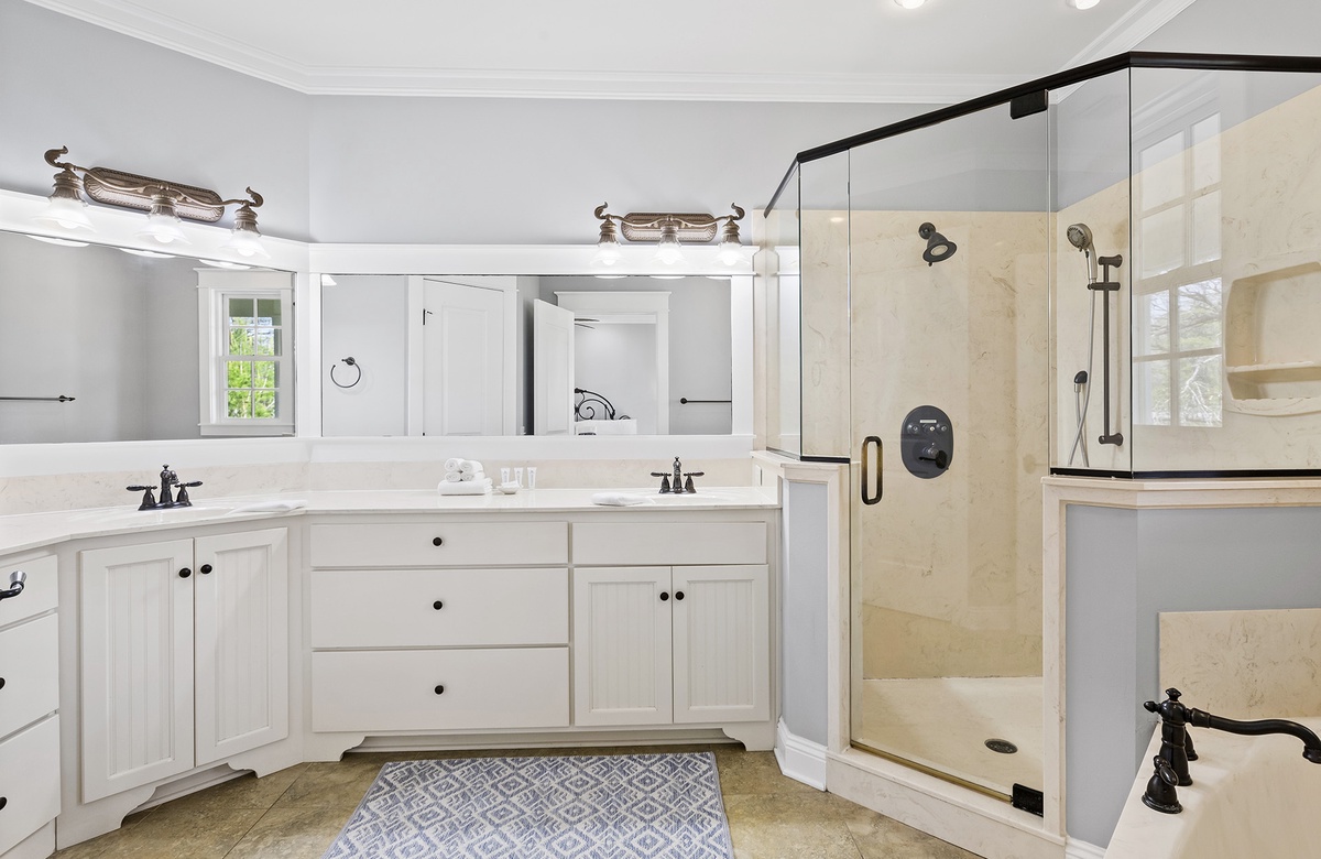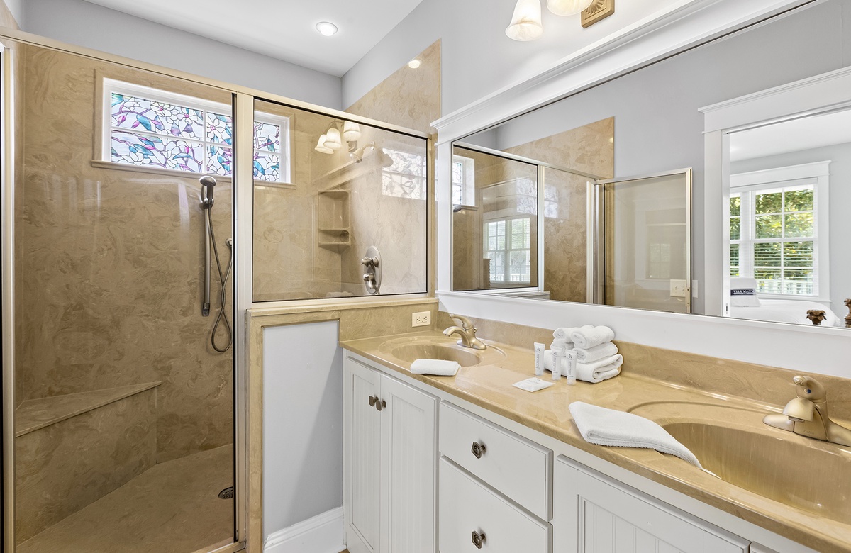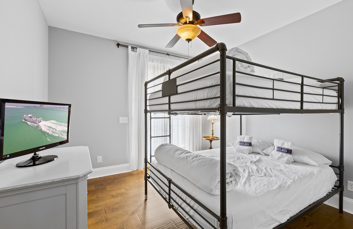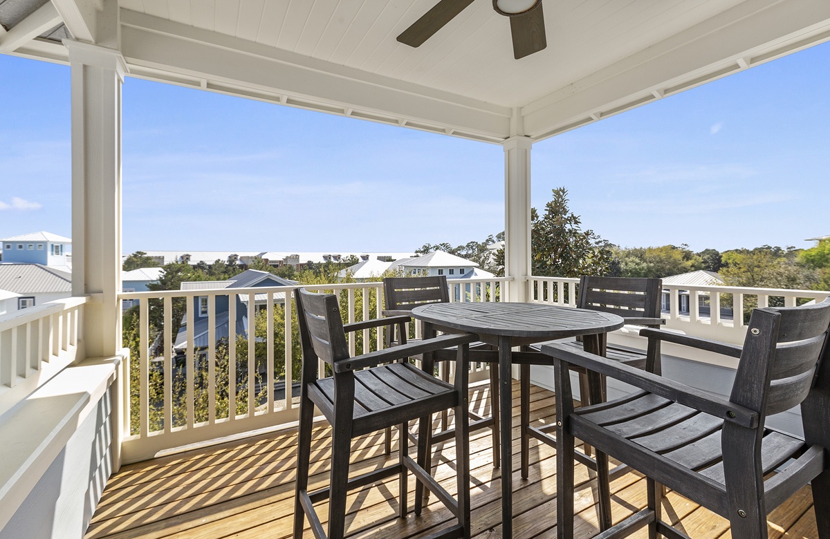 Bedrooms are located on all three levels of the home. The first floor’s guest bedroom has a queen-size bed, a bathroom with a walk-in shower, and patio access. On the second floor, you will find the primary suite and two guest bedrooms. The spacious primary bedroom boasts a king-size bed, flatscreen TV, and access to a romantic balcony. Its luxurious ensuite bath features an angled counter with dual vanities, a huge walk-in shower, and a deep soaking tub. One guest bedroom on this level has a queen-size bed and access to a private balcony, and the other has a queen-size bunk. Ascend the stairs to the third level, where the last guest bedroom features two twin beds and access to a covered balcony furnished with a raised table and chairs.