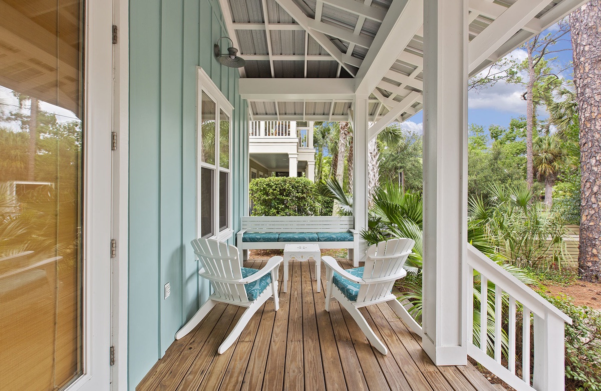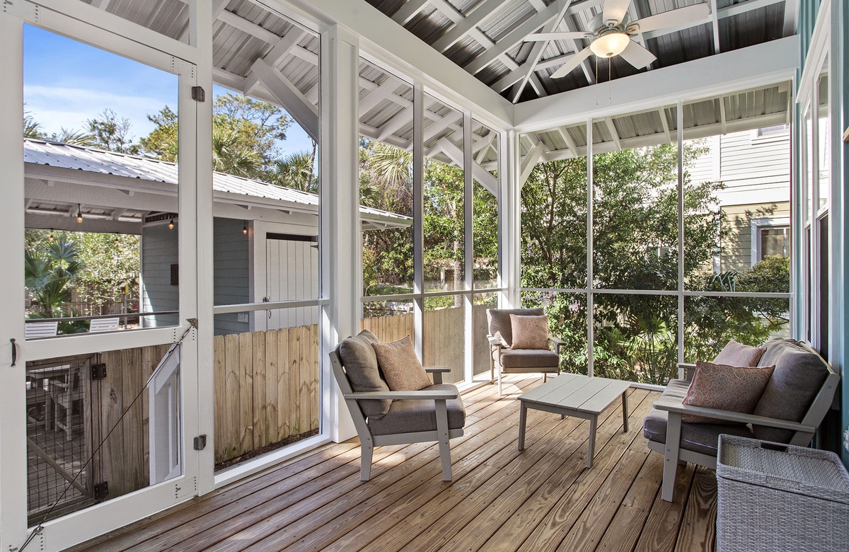 - Comfortable screened porch off living room that overlooks the private pool