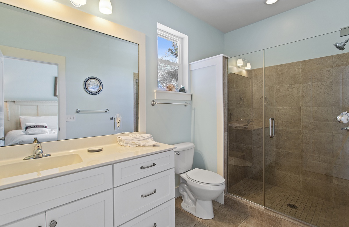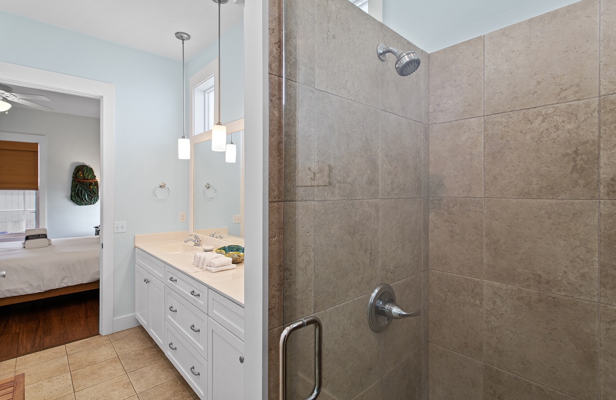 - King bedroom with private bathroom, single sink, large shower only