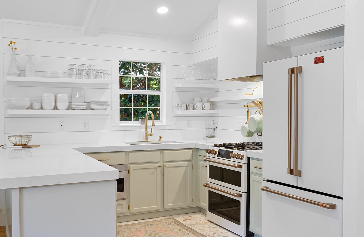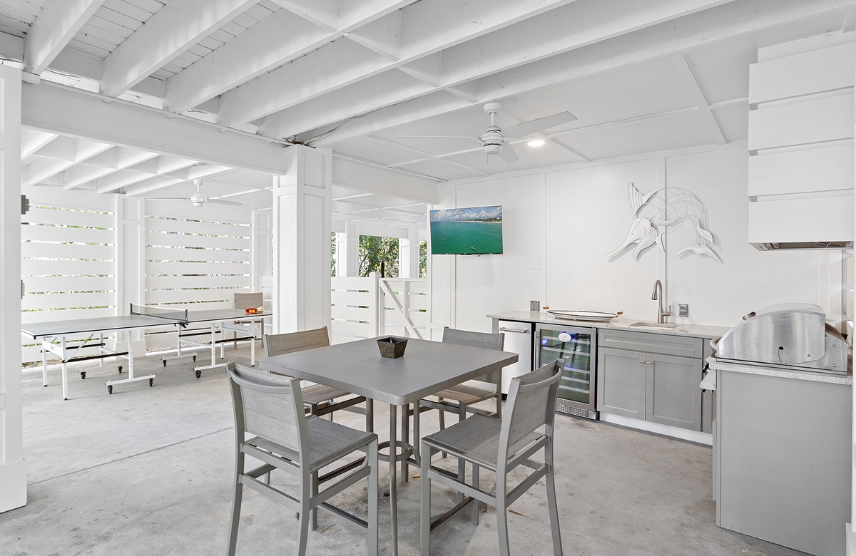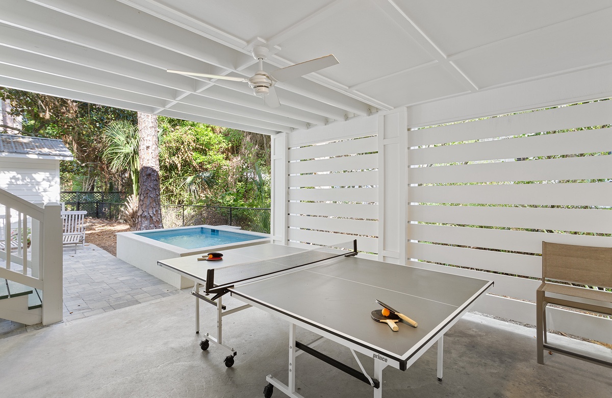 Upon entering Grayton Time, you are greeted by charming verandas at both the front and back of the raised beach home, with convenient parking underneath. Inside, the bright and open living area features a soaring white-paneled cathedral ceiling and rich honey-toned hardwood floors. Coastal-style couches and patterned accent chairs surround a cozy gas Franklin Stove and a large wall-mounted flatscreen TV, creating an inviting space to relax. The dining area includes a natural hardwood table with six coastal-inspired chairs, while the state-of-the-art kitchen boasts shiplap walls, creamy white cabinetry, and a colorful backsplash tile. Glass doors open to a screened veranda, perfect for outdoor living and dining. Down the outdoor staircase, you'll find a patio with a plunge pool, ping pong table, covered dining area, wet bar with a wine cooler, and a full bath for rinsing off after the beach.