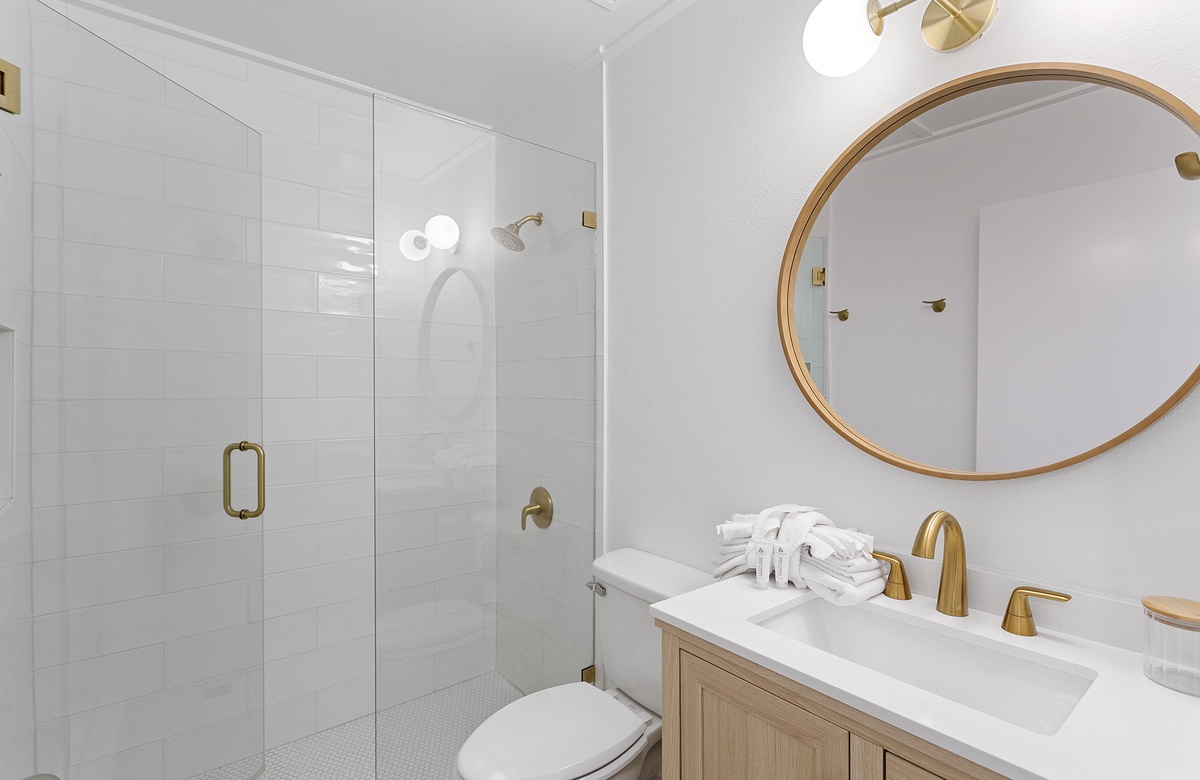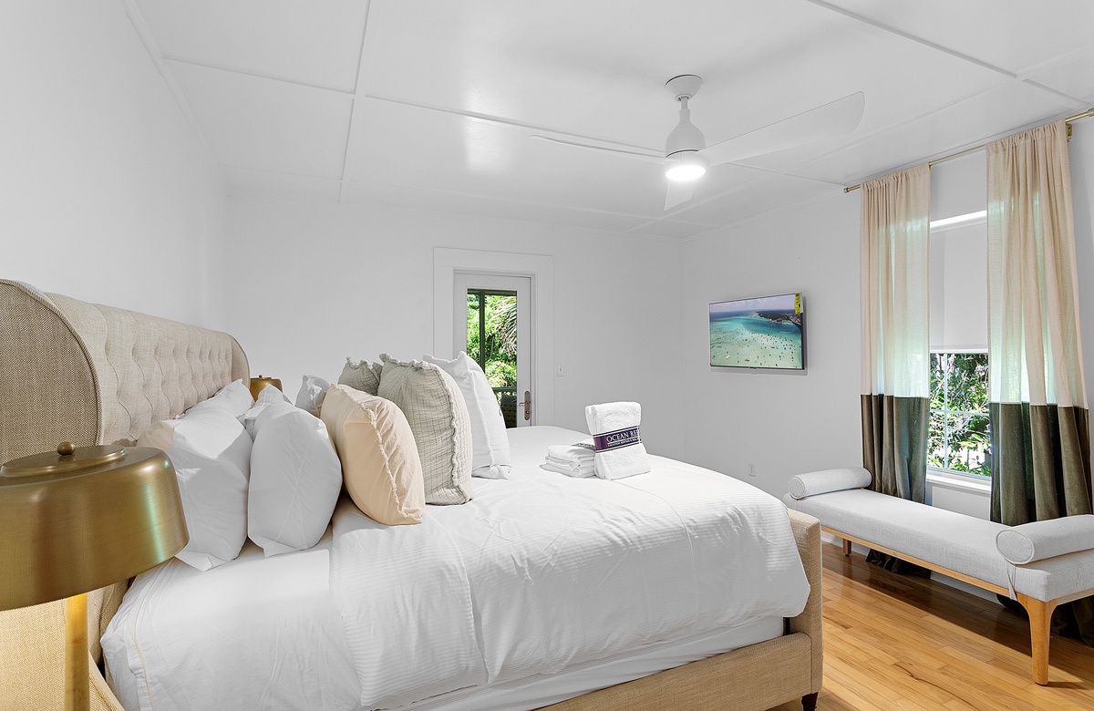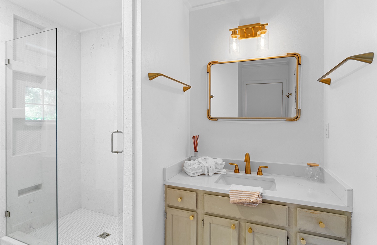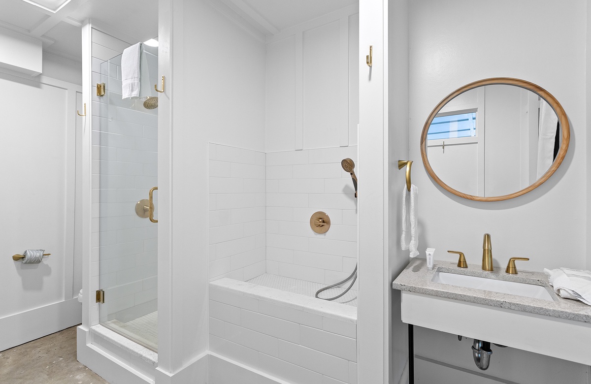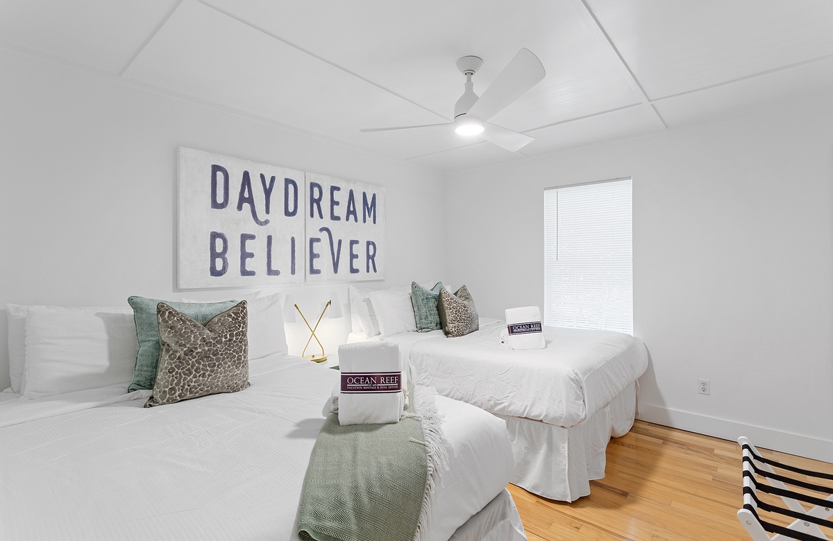 The primary and guest bedrooms each feature king-size beds and access to a lovely screened porch, providing a serene retreat for restful nights. The primary bedroom includes an ensuite bath with a walk-in shower, while a hall bath with a walk-in shower serves the additional guest quarters, which include a bedroom with two queen-size beds. The bedrooms at Grayton Time are designed to provide you with the utmost comfort, ensuring a peaceful and relaxing stay.