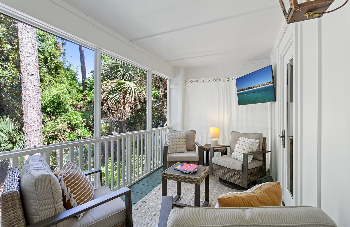 Second Floor: Living Room, Kitchen, Dining, King Primary Bedroom with Walk-In Shower + Screened Balcony Access, King Bedroom with Screened Balcony Access, Bedroom with Two Queen Beds, Hall Bath with Walk-In Shower