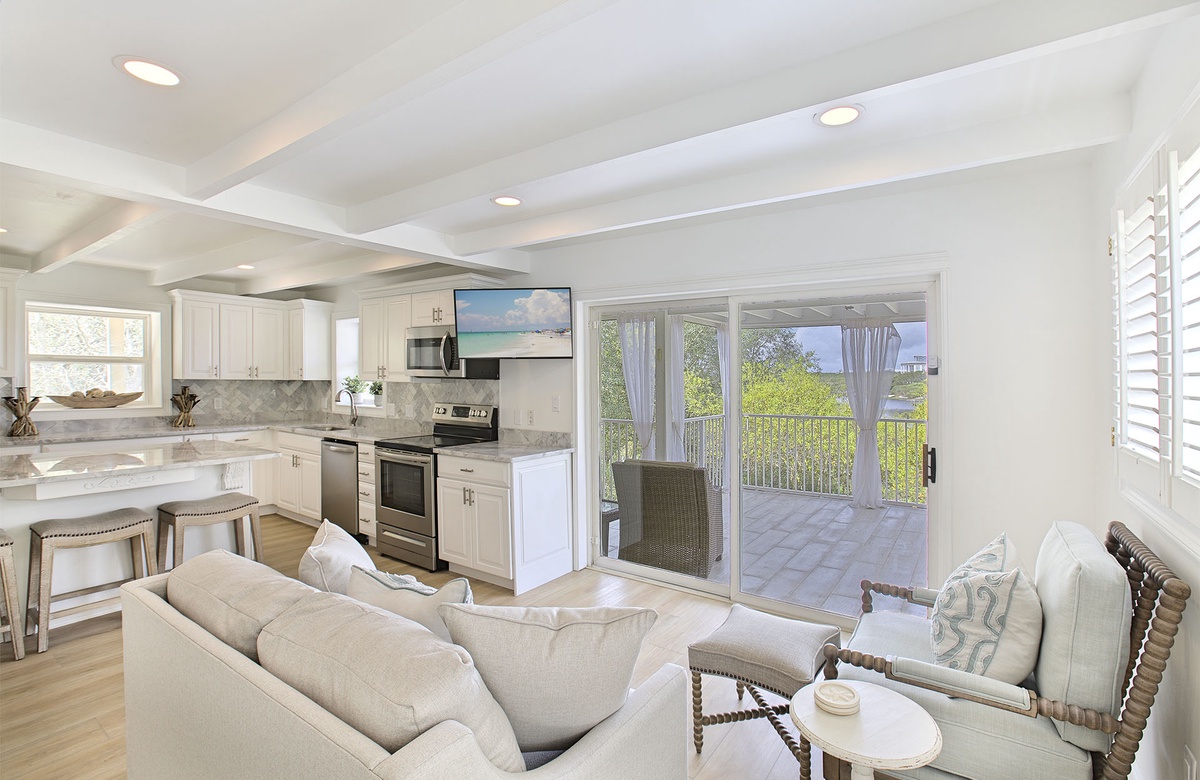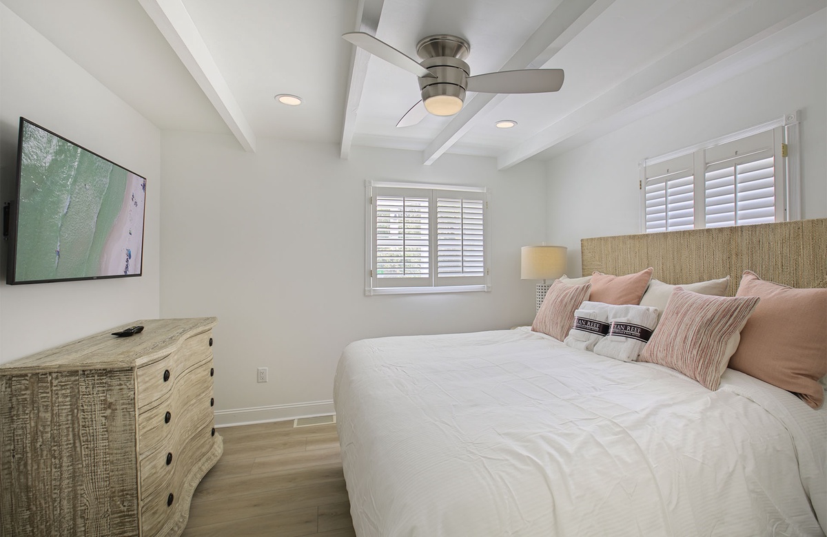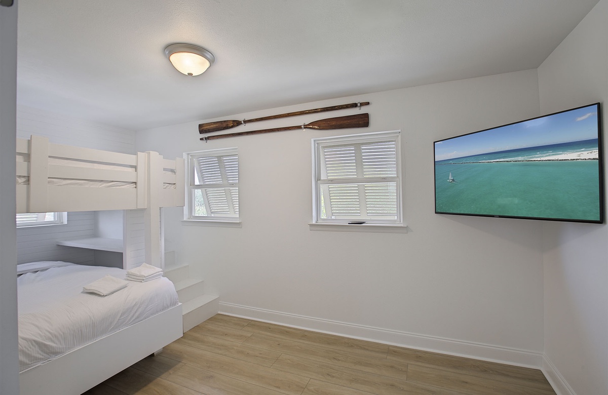 On the second level, there are three guestrooms. One guest room boasts a king-size bed and flatscreen TV. The remaining guestrooms are bunkrooms, one of which has a queen bunk, while the other has two twin bunks. The guestrooms share access to a full hall bath with double vanities and a walk-in shower. This level also provides a bonus den that includes a cream couch, seafoam armchair, tropical pillows and decor, and a flatscreen TV. A sliding glass door leads to an upper-level viewing deck.