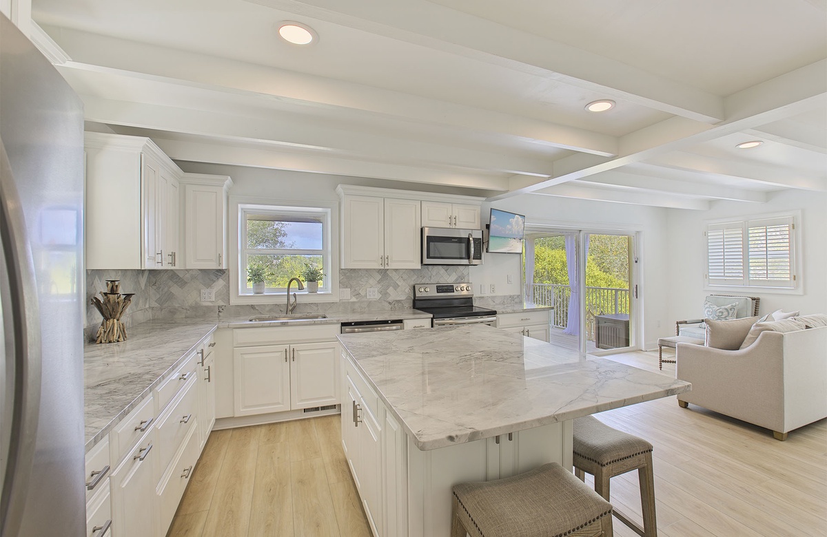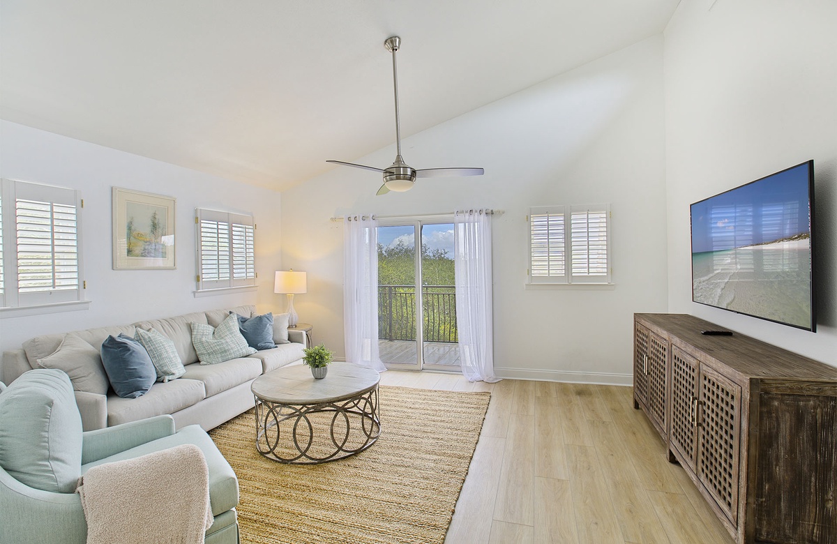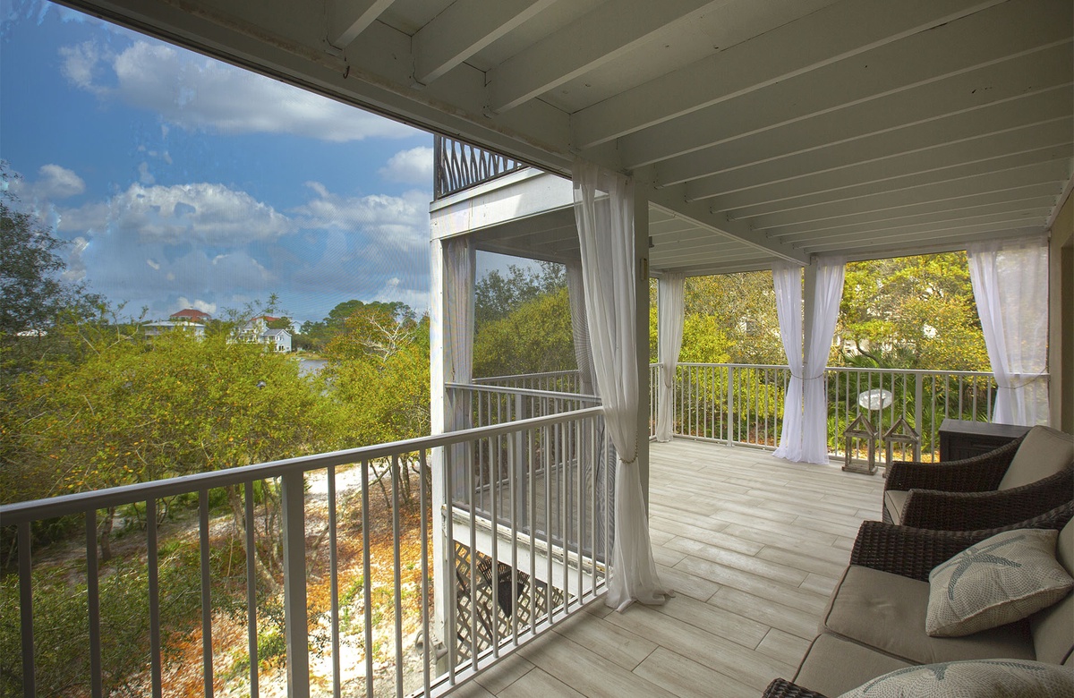 Tucked in its own private world beside Stallworth Lake, guests will fall in love with the secluded location of this beach home. Live oaks and palm trees greet you upon arrival, and the contemporary Florida style immediately transports you to a vacation mindset. Inside, the first floor features an inclusive floorplan for the living, kitchen, and dining areas. The open kitchen is large and sunny with white cabinetry, stainless-steel appliances, marble-topped counters, and a gleaming breakfast bar and stool seating. Tucked in a dining nook, a cottage-styled table with four chairs and bench seating provide an intimate setting for vacation meals. The adjacent living room includes a white loveseat, accent chair, and a TV. Sliding glass doors open onto a shaded, wrap-around veranda. The veranda has plenty of outdoor seating, allowing guests to enjoy views of the lake and bask in the perfect tropical weather of the Gulf Coast.