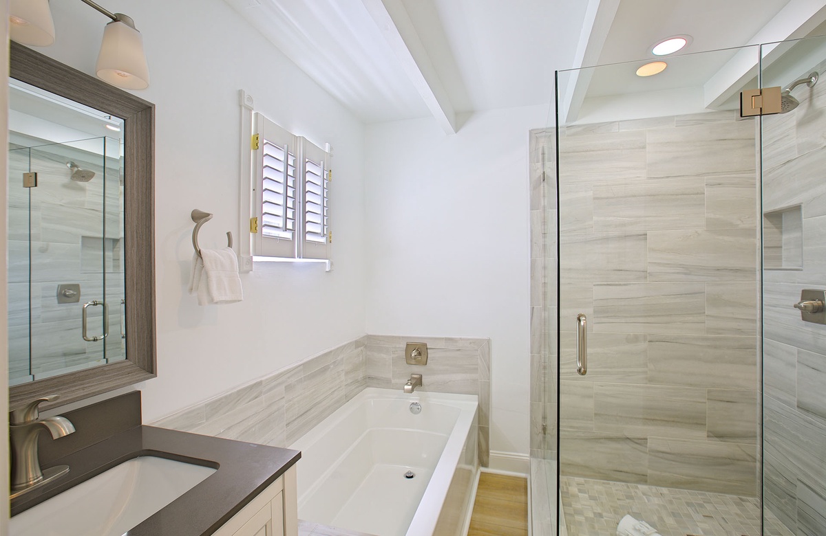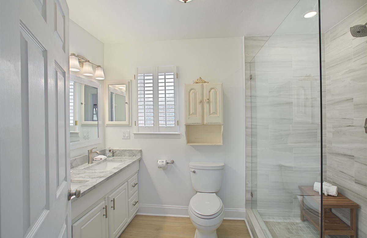 The master suite is also located on the first level. It gives off a tropical ambiance and features a king-size bed, rustic dresser, and flatscreen TV. The master suite has access to a full en-suite bath, which has a soaking tub and walk-in shower.