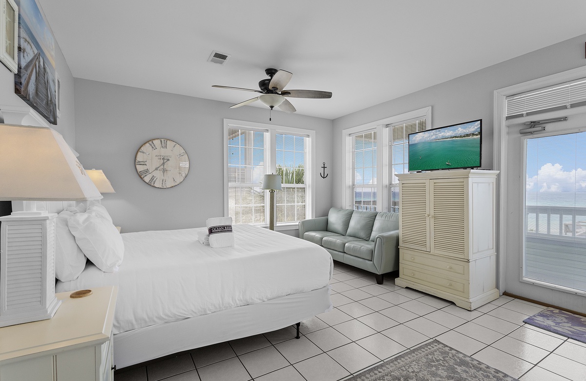 - King bedroom with private bathroom, TV, sitting area, wet bar