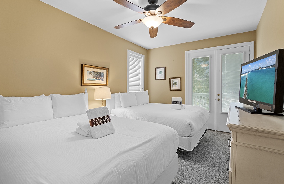 - Double queen with shared hall bathroom, TV