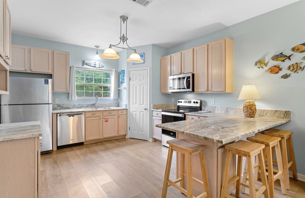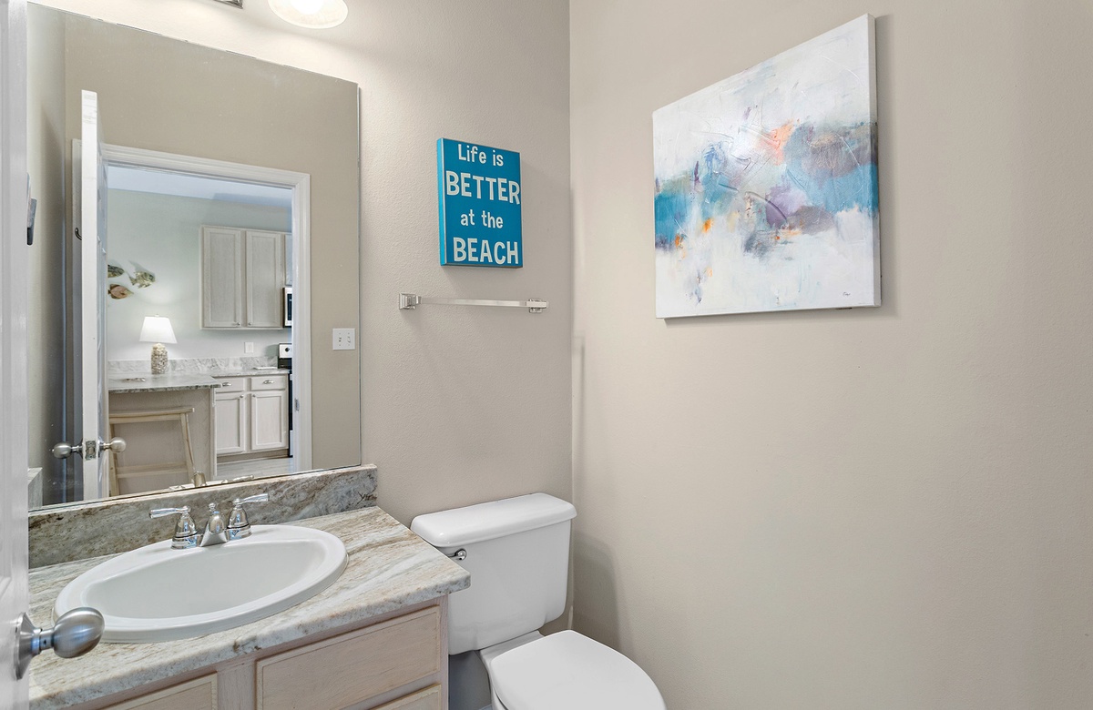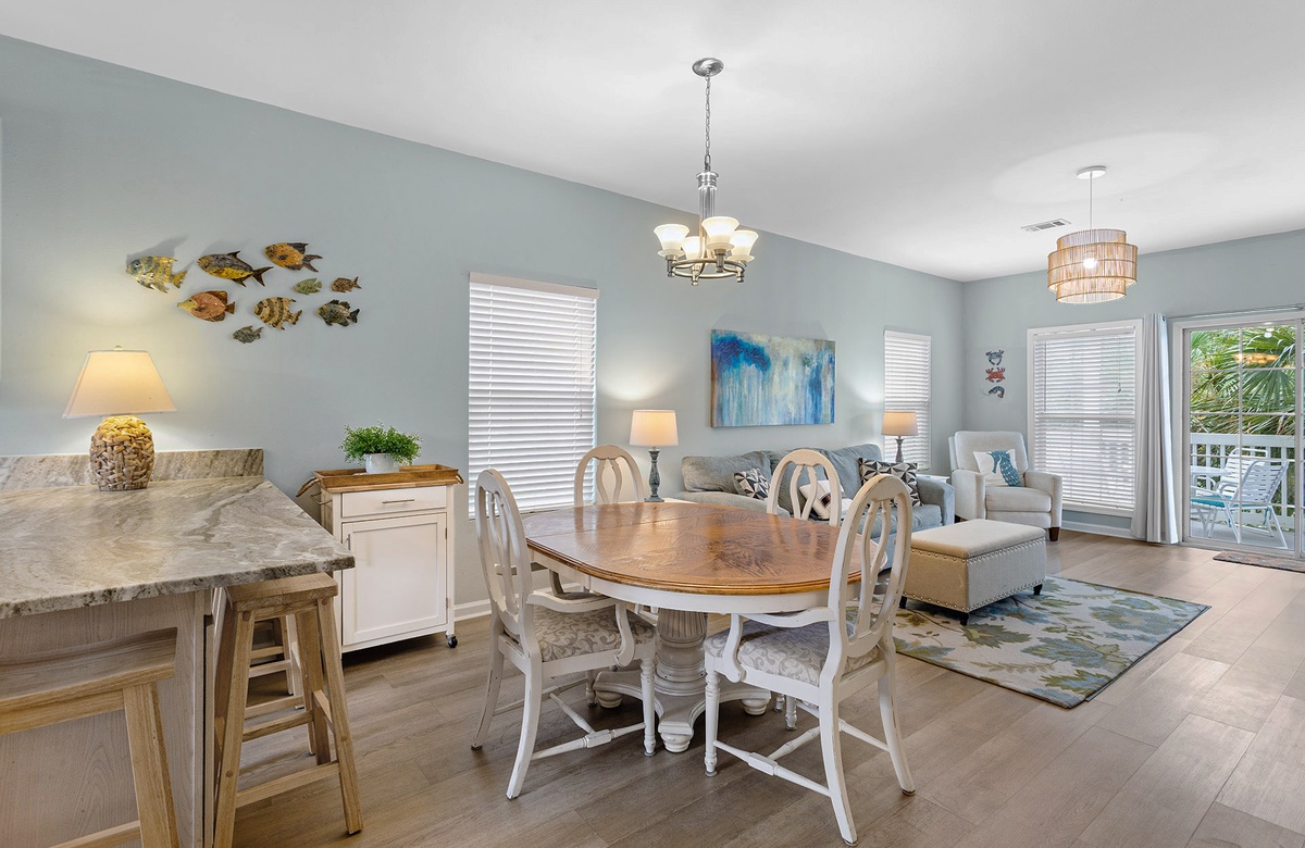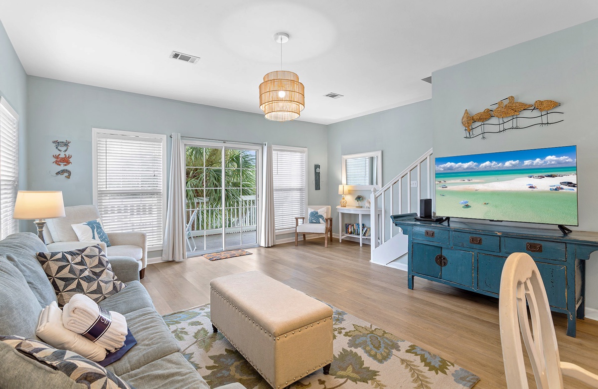 Legends 7 is a bright, beach-inspired townhome that captures the essence of a relaxed 30A getaway. With two bedrooms, two-and-a-half baths, and ample space to accommodate up to eight guests, this cheerful retreat offers the perfect balance of comfort and coastal style. The open-concept main level is warm and inviting, featuring plush furnishings, a soft dove-gray sleeper sofa, and beach-chic décor that instantly puts you in vacation mode. Enjoy meals and conversation at the sunny dining nook or gather at the sleek granite breakfast bar in the fully equipped kitchen, complete with stainless steel appliances. Upstairs, each bedroom is a private haven with its own bath—ideal for families or friends traveling together. The Primary Suite stands out with vaulted ceilings, a private balcony for morning coffee or evening breezes, and a spa-inspired bath with a soaking tub and walk-in shower.
