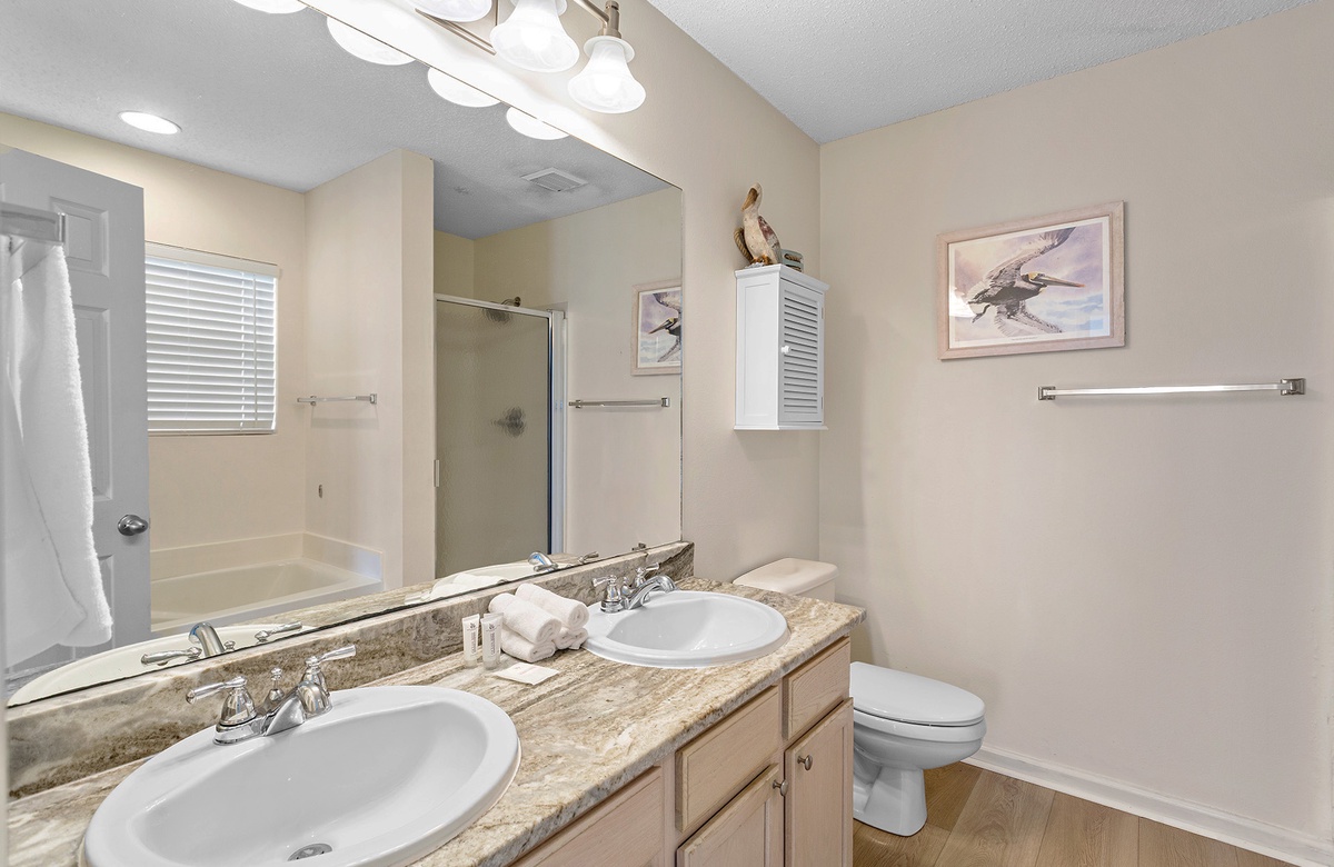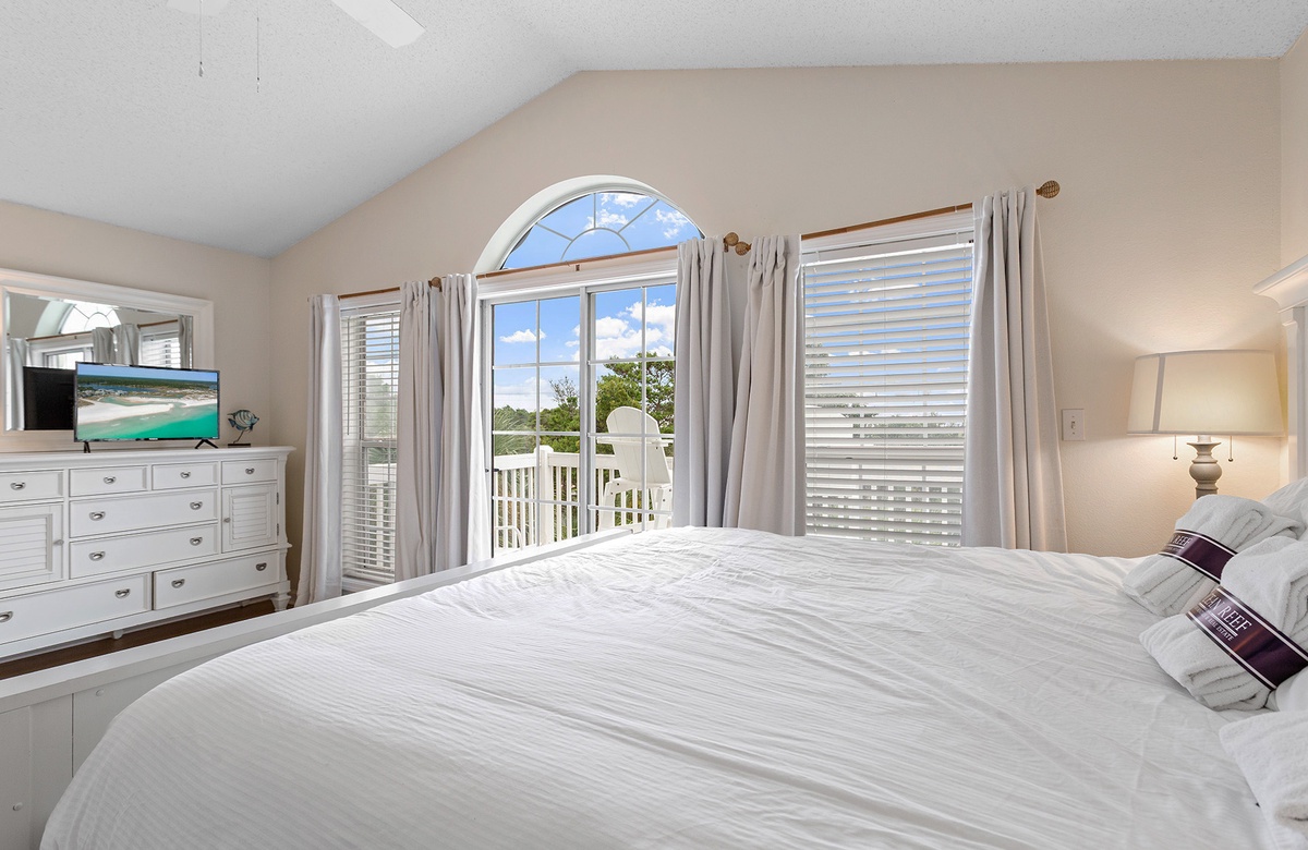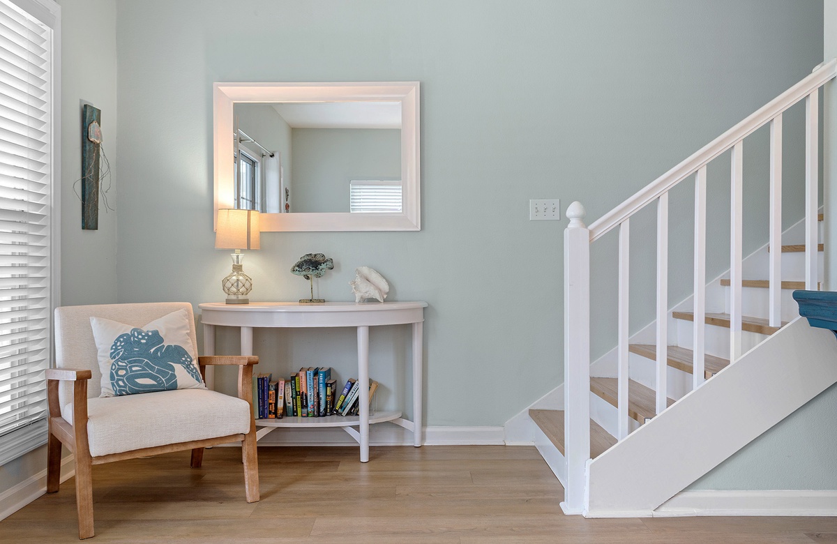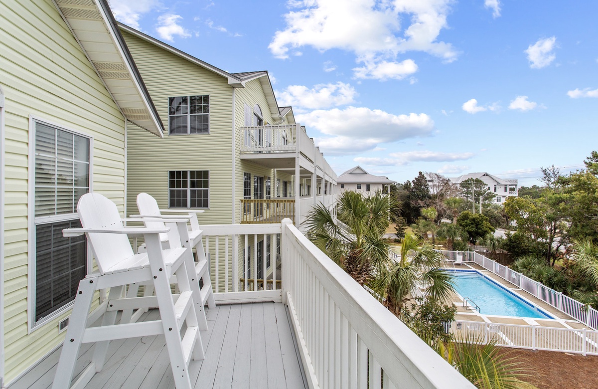 Legends 7 is a bright, beach-inspired townhome that captures the essence of a relaxed 30A getaway. With two bedrooms, two-and-a-half baths, and ample space to accommodate up to eight guests, this cheerful retreat offers the perfect balance of comfort and coastal style. The open-concept main level is warm and inviting, featuring plush furnishings, a soft dove-gray sleeper sofa, and beach-chic décor that instantly puts you in vacation mode. Enjoy meals and conversation at the sunny dining nook or gather at the sleek granite breakfast bar in the fully equipped kitchen, complete with stainless steel appliances. Upstairs, each bedroom is a private haven with its own bath—ideal for families or friends traveling together. The Primary Suite stands out with vaulted ceilings, a private balcony for morning coffee or evening breezes, and a spa-inspired bath with a soaking tub and walk-in shower.