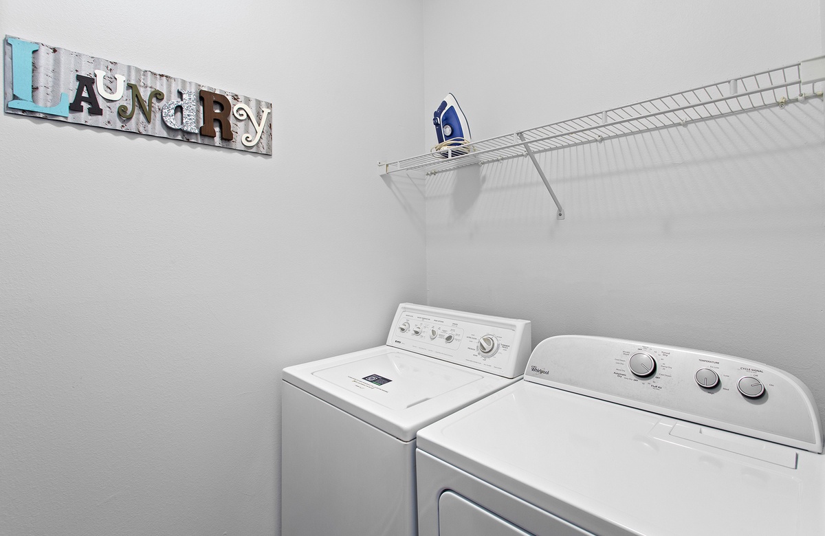 Second Floor: Living Room with Queen Sleeper Sofa and Balcony Access, Kitchen, Dining, Powder Room, Laundry.