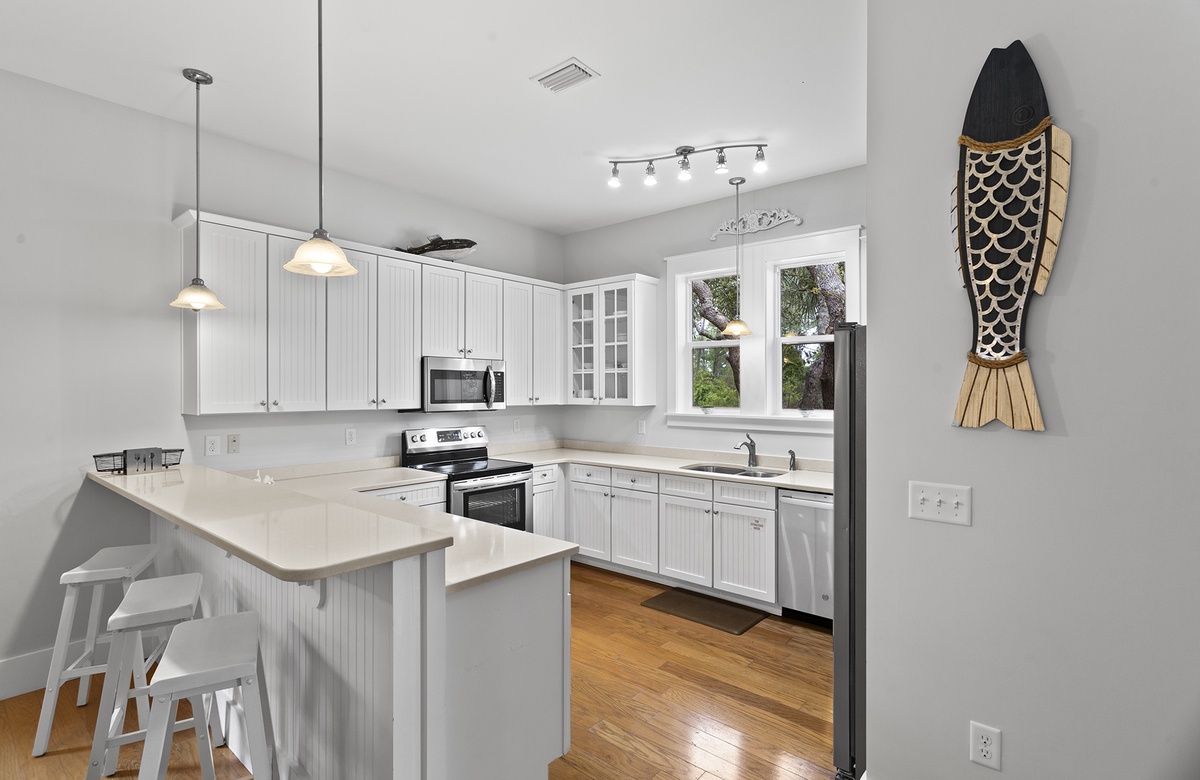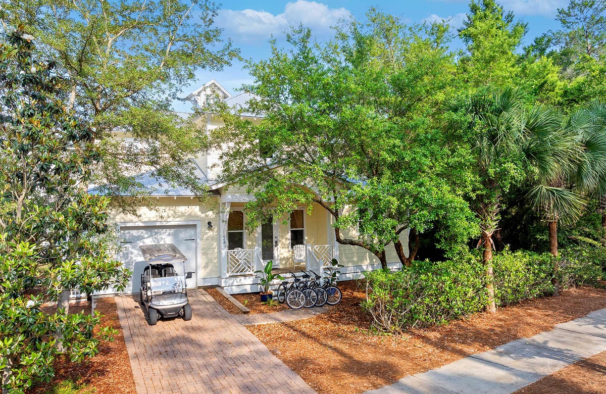 Lion on the Beach, a delightful two-story home nestled in Seagrove Beach south of scenic 30A, exudes charm and a cheerful spirit. This three bedroom haven, painted in a vibrant Americana-inspired yellow with white trim, can comfortably accommodate up to eight guests. Its welcoming veranda, outfitted with rocking chairs, offers a perfect spot to unwind while enjoying views of a beautifully landscaped front yard—ideal for sipping ice-cold lemonade or a frozen margarita on a warm summer day.