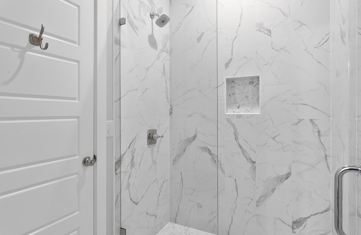 First Floor: Living Room with Patio Access, Kitchen, Dining, King Primary Bedroom with Shared Walk-In Shower.