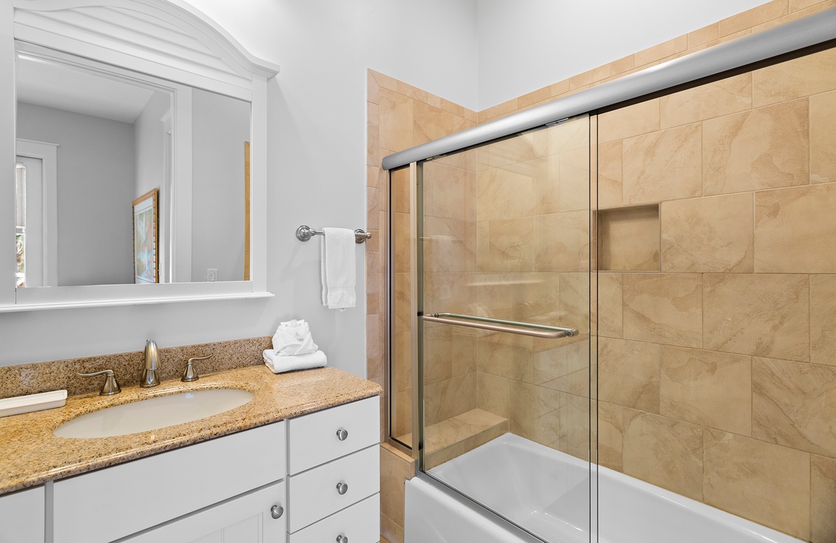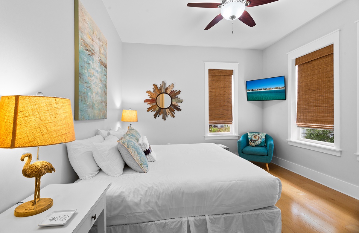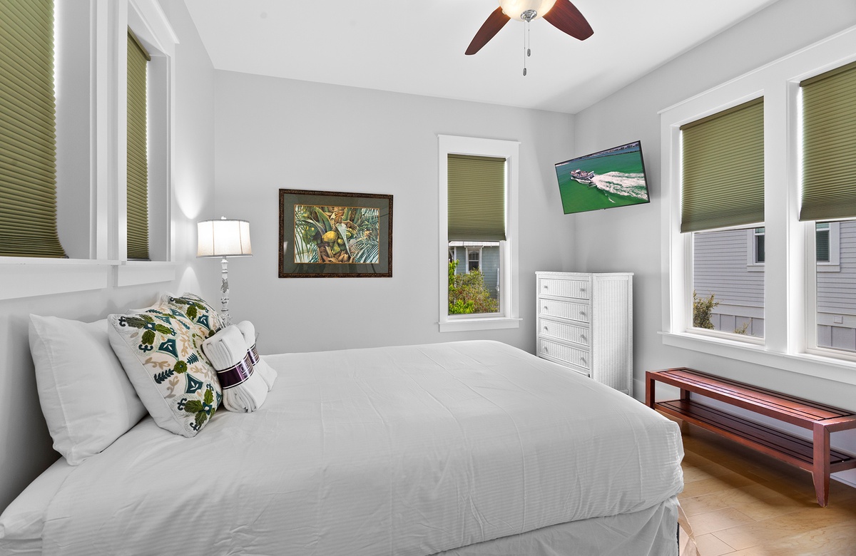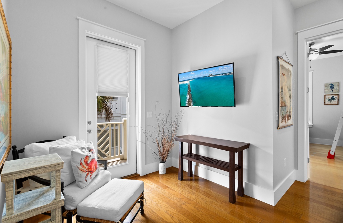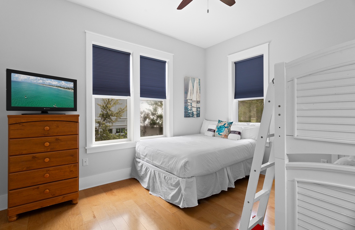 The primary bedroom on the first floor is a serene retreat with multiple windows, a king-size bed under an abstract waterscape painting, and a stylish vintage modern chair. It has access to a hall bath featuring white-veined marble and a walk-in shower. The second-floor houses two guest bedrooms that share a full bath with a granite-topped vanity and a tub shower combination tiled in Travertine marble. One guest bedroom offers a queen-size bed, while the second is ideal for a small family, featuring a queen bed and a twin bunk. A cozy den with additional seating and a wall-mounted flatscreen TV provides a relaxed viewing area, and glass doors open onto a balcony.
