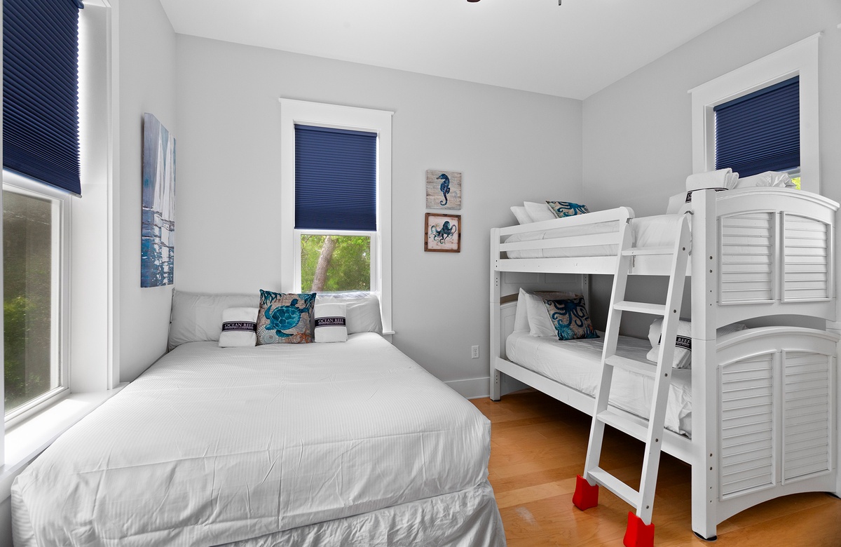 Second Floor: Queen Bedroom, Hall Bath with Tub/Shower Combo, Queen Bedroom with Twin Bunk, Sitting Area with Balcony Access, Laundry.