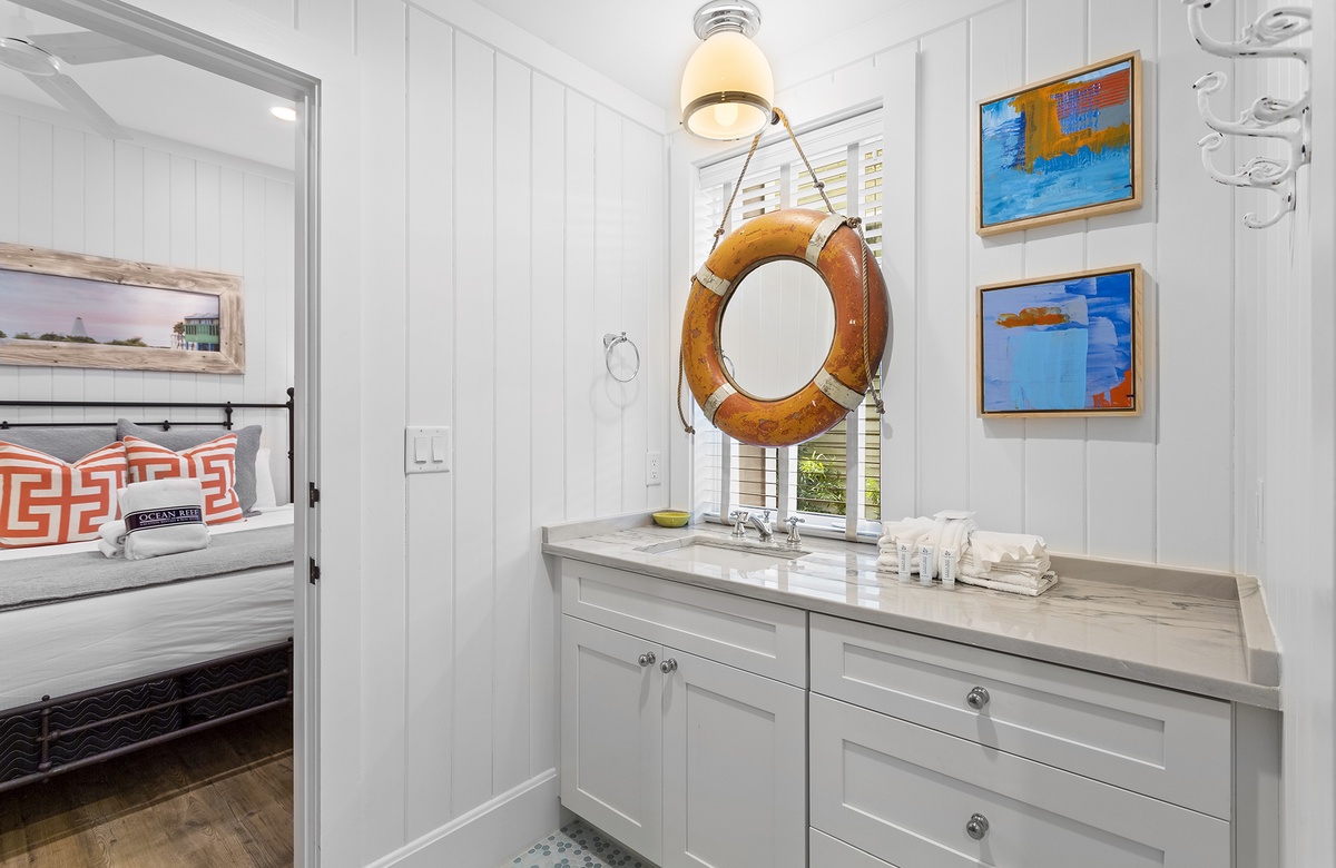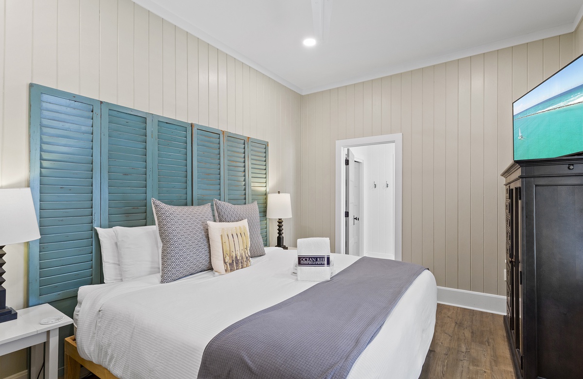 There are three bedrooms in the main house. One of these is the primary suite with a king-size bed and turquoise-paneled headboard. The room has sandy-colored shiplap walls, a handsome dresser, TV, and a private bath with a walk-in shower. One of the guest bedrooms has a king-size bed, TV, and ensuite bath. The other guest bedroom includes a twin-over-full bunk, a reading chair, and wall-mounted TV.