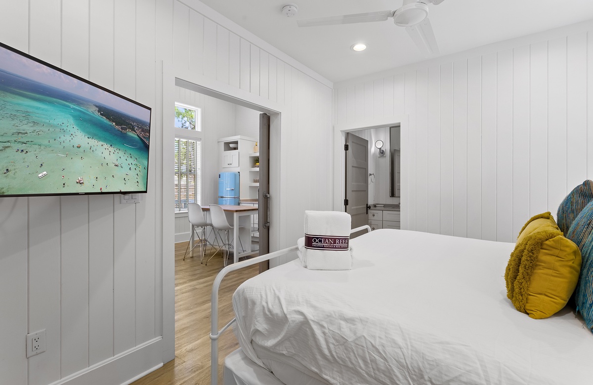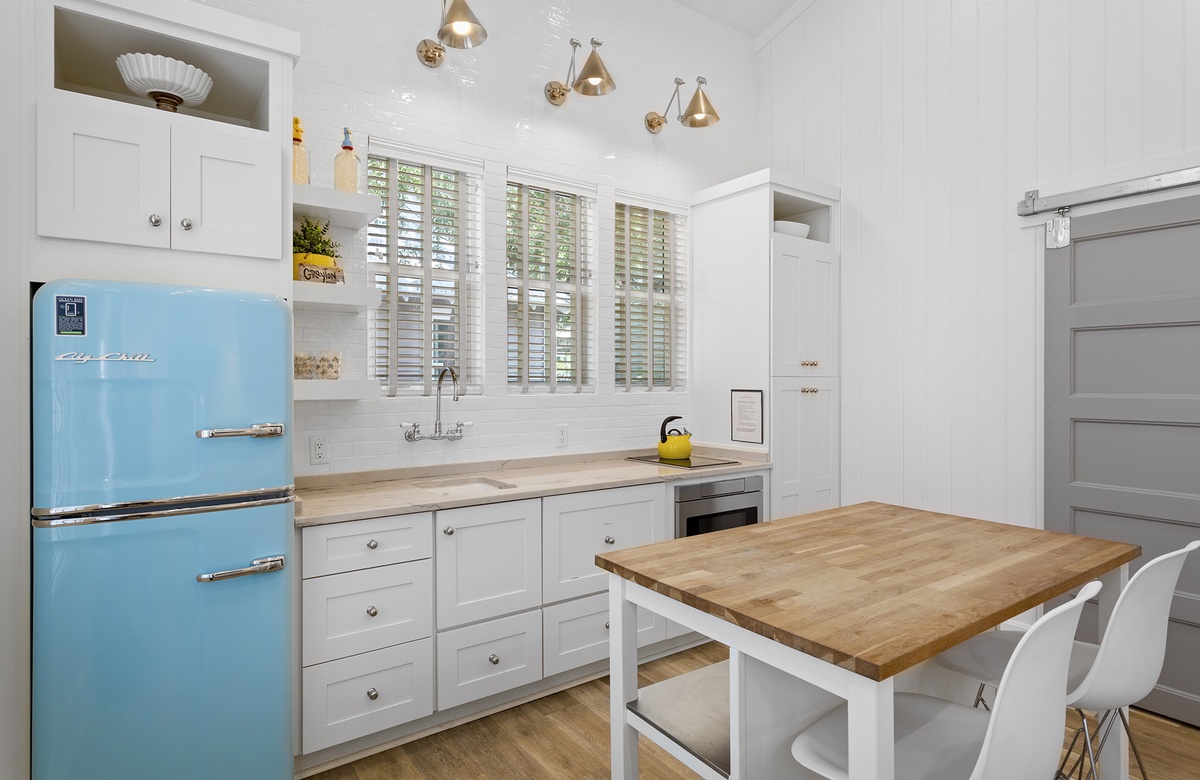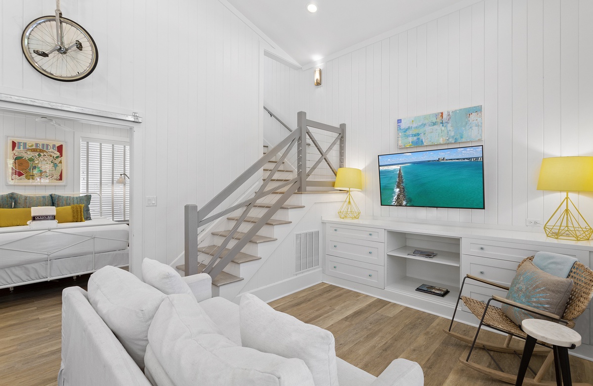 Head over to the guest cottage, Bella Luna, where you will find a cozy great room and two bedrooms. The interior showcases its coastal vibe with shiplap walls, white furnishings, and light hardwood floors. In the living area, a cream-colored couch faces a TV and built-in shelving. The adjacent dine-in kitchen has white cabinetry, an island with seating for two, and a turquoise refrigerator that matches the one in the main house. A sliding barn door off the living area leads to a king-size guest bedroom. The primary suite is located up the stairs and includes a king-size bed, TV, and ensuite bath.