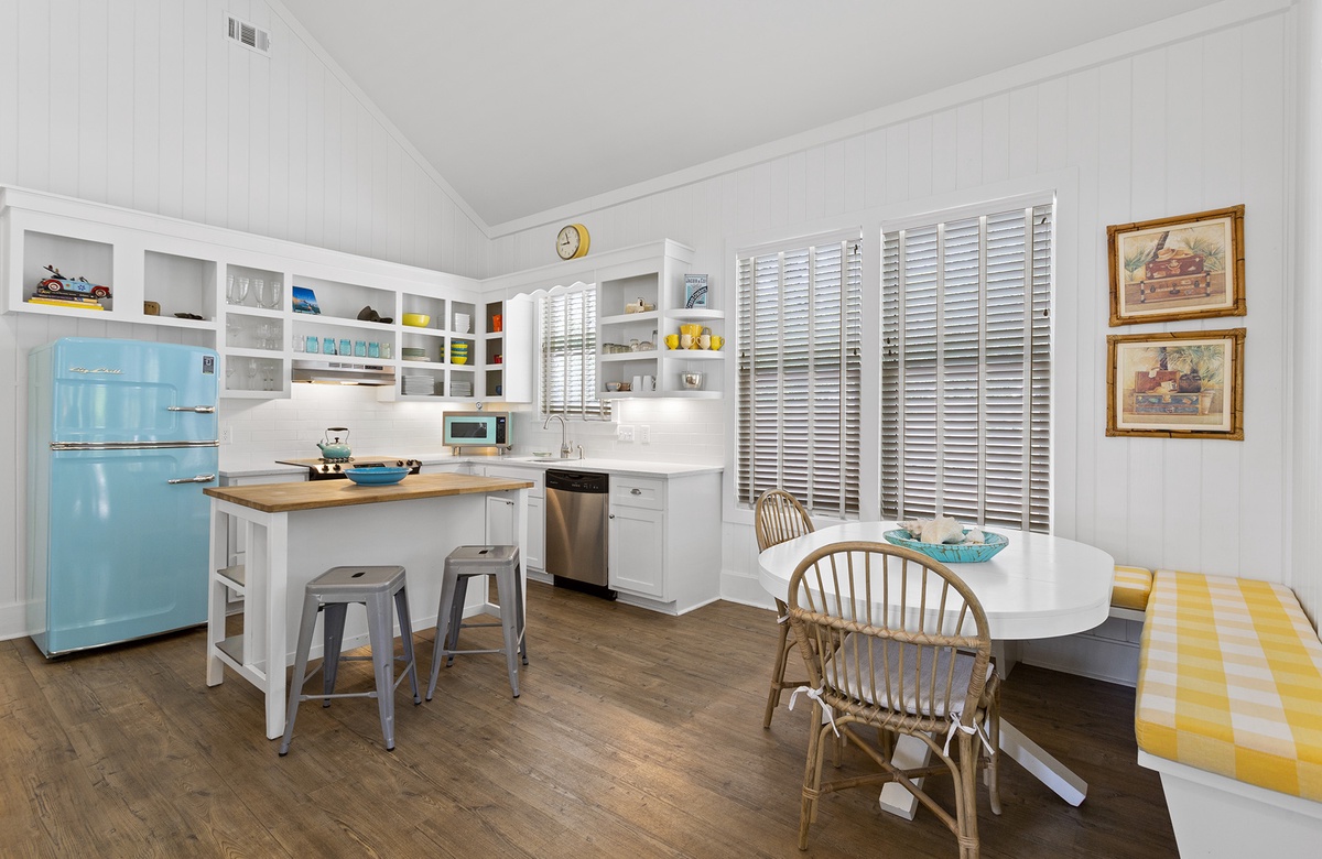 In the main cottage, Goodnight Moon, you’ll find an open floor plan, lots of windows, hardwood floors, and colorful accents throughout. The living room boasts a seafoam-colored wraparound couch and two armchairs that provide comfortable seating for guests. The couch and chairs are centered around a Persian rug and wood-topped drink table. A rustic wood entertainment center and wall-mounted TV bring it all together. Wood floors flow into the open kitchen. Open shelves showcase colorful dishes. Sleek white counters and the kitchen island offer ample space to cook vacation meals. The kitchen has stainless steel appliances and a retro-styled refrigerator and microwave. A casual dining area sits beside the kitchen. Set in the corner beside window, the dining area includes a table, two chairs, and bench seating with yellow-checkered cushions.