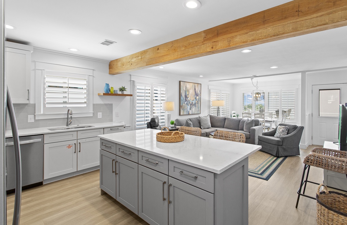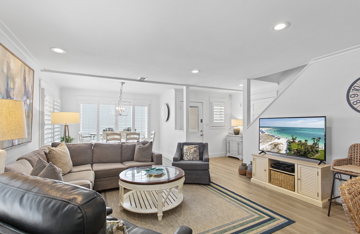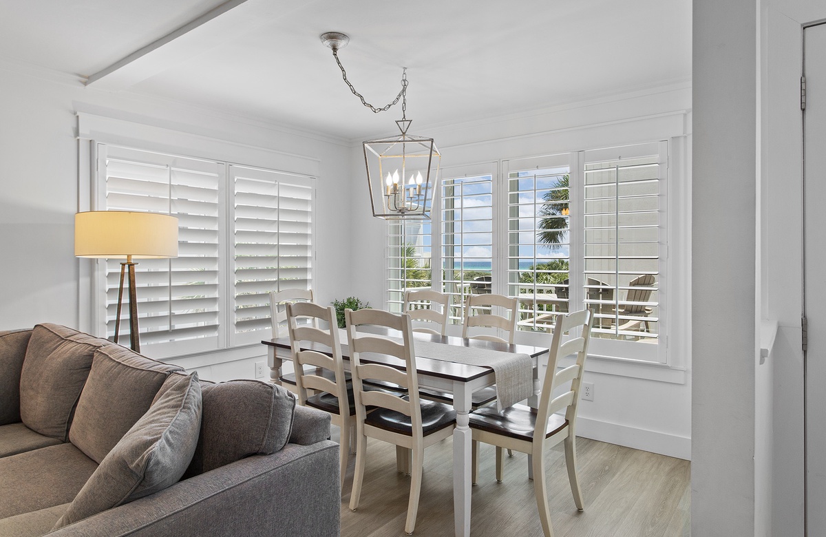 Upstairs, the second level is dedicated to an expansive great room, including the living room, dining area, and kitchen. The living room includes a sectional, a beach-inspired accent chair, and an additional armchair. This seating ensemble is centered around a decorative rug and round drink table that faces a cream-colored credenza and flatscreen TV. Beach-washed vinyl flooring flows into the dining nook, where large windows create a bright, warm atmosphere. The dining room has a cottage-style table and six chairs that sit beneath a candle chandelier. On the other side of the living room, the kitchen features custom cabinetry, sleek countertops, and a breakfast island with raised chair seating. Guests can access a furnished sundeck from the living room, which is great for soaking up the Florida sun and gorgeous weather. A half-bath powder room is also located on this level with a stacked washer and dryer.