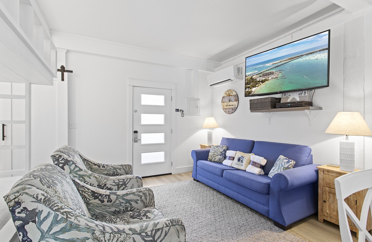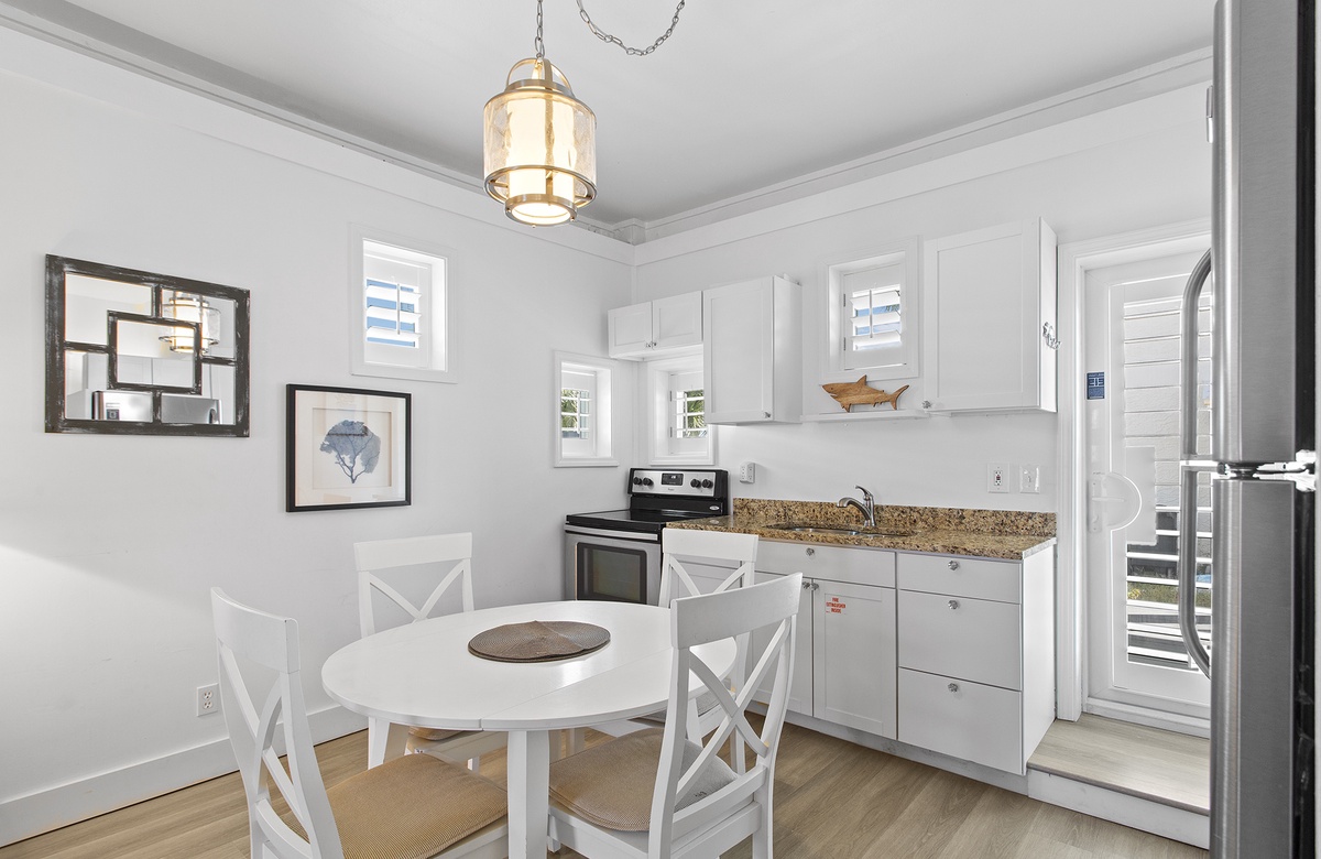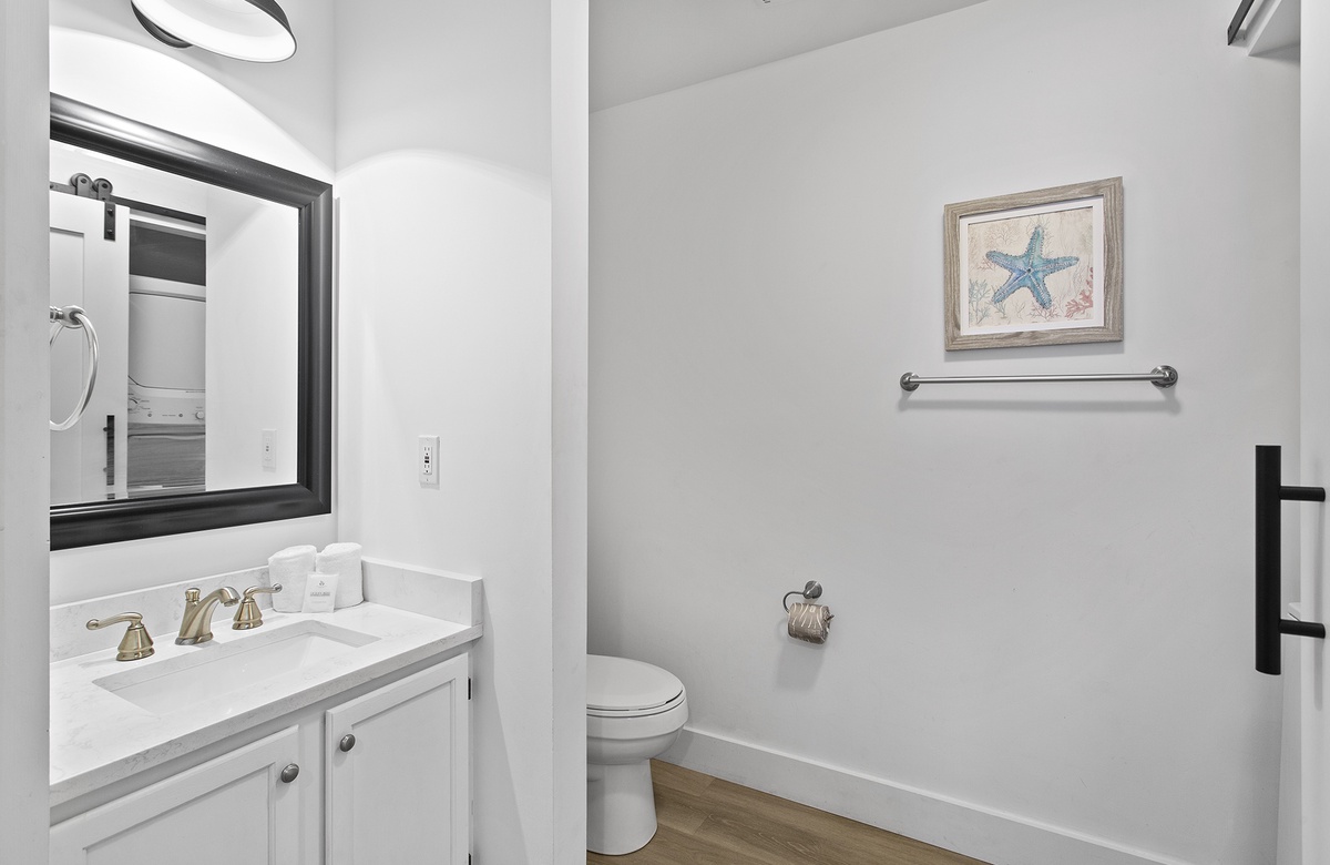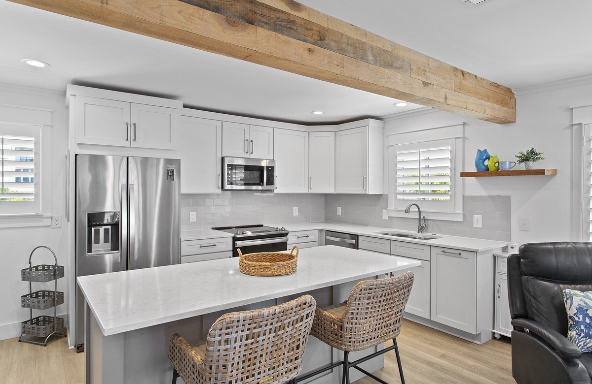 Upstairs, the second level is dedicated to an expansive great room, including the living room, dining area, and kitchen. The living room includes a sectional, a beach-inspired accent chair, and an additional armchair. This seating ensemble is centered around a decorative rug and round drink table that faces a cream-colored credenza and flatscreen TV. Beach-washed vinyl flooring flows into the dining nook, where large windows create a bright, warm atmosphere. The dining room has a cottage-style table and six chairs that sit beneath a candle chandelier. On the other side of the living room, the kitchen features custom cabinetry, sleek countertops, and a breakfast island with raised chair seating. Guests can access a furnished sundeck from the living room, which is great for soaking up the Florida sun and gorgeous weather. A half-bath powder room is also located on this level with a stacked washer and dryer.