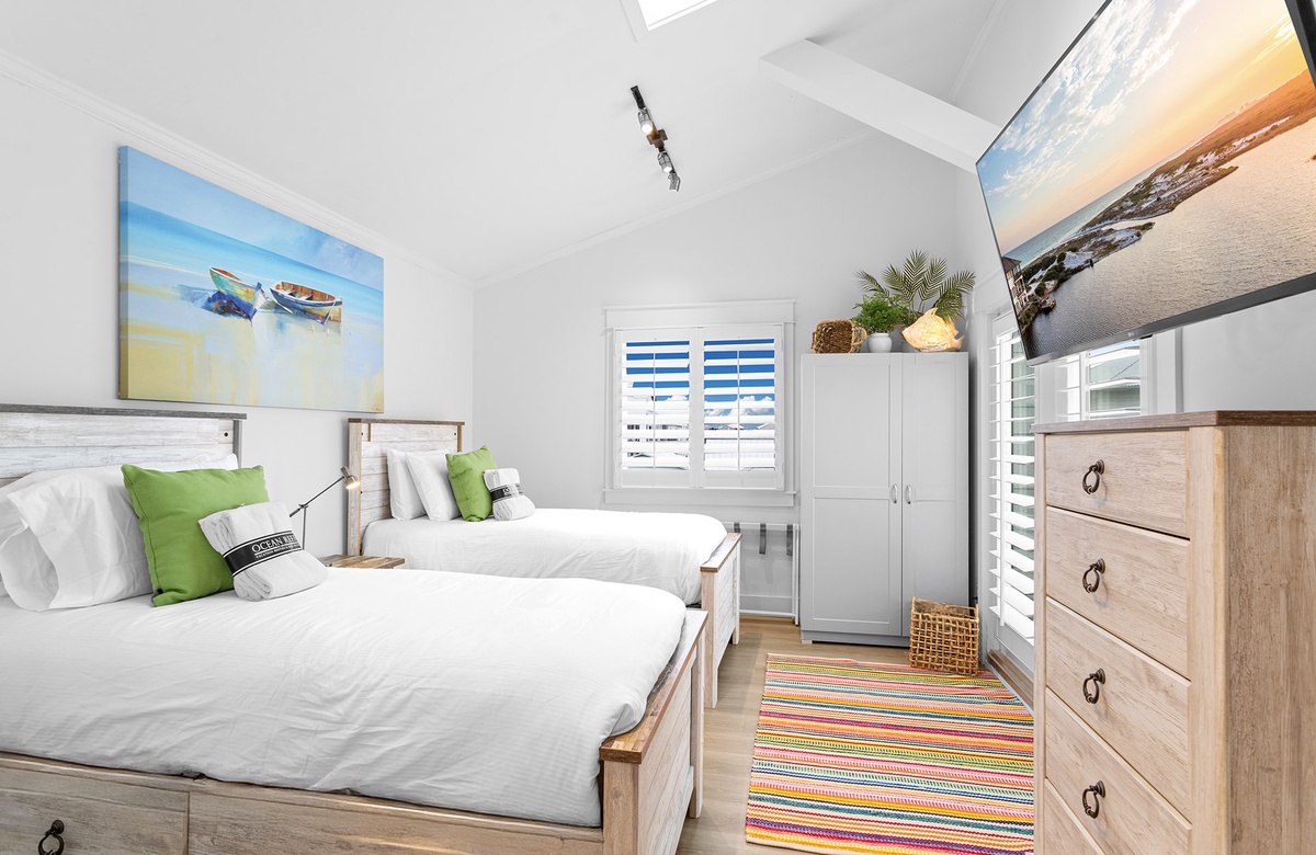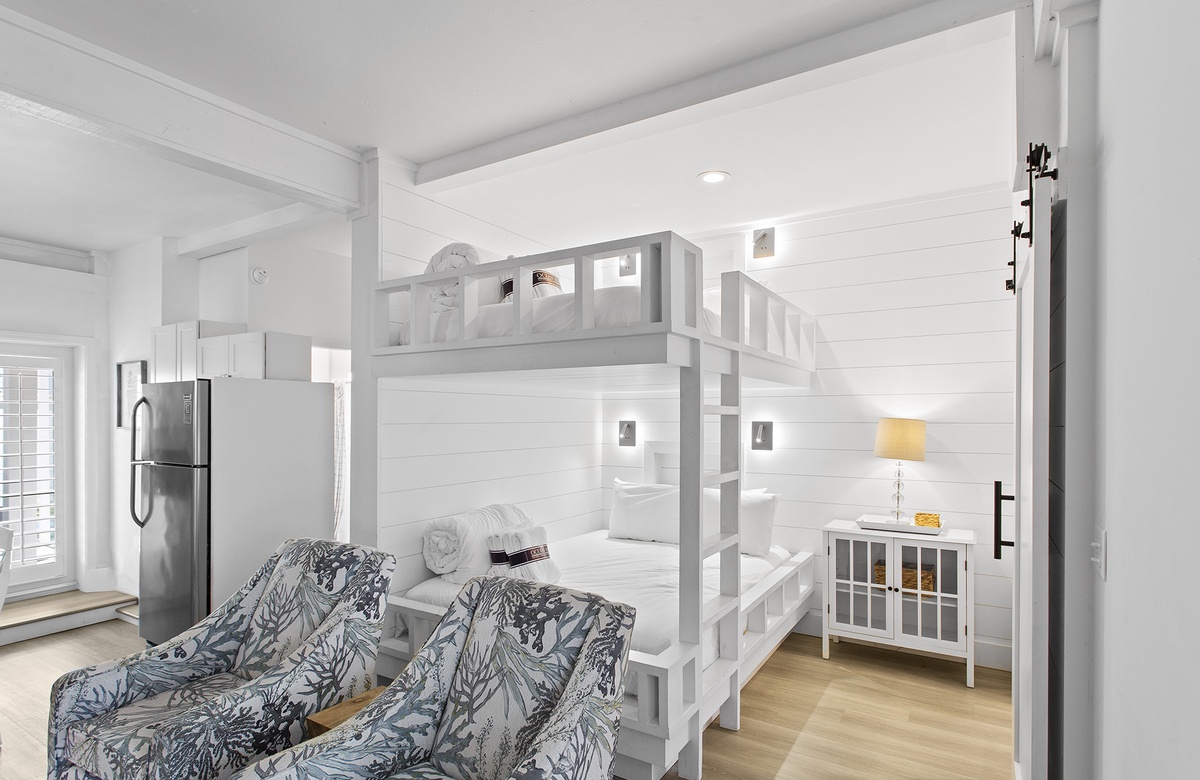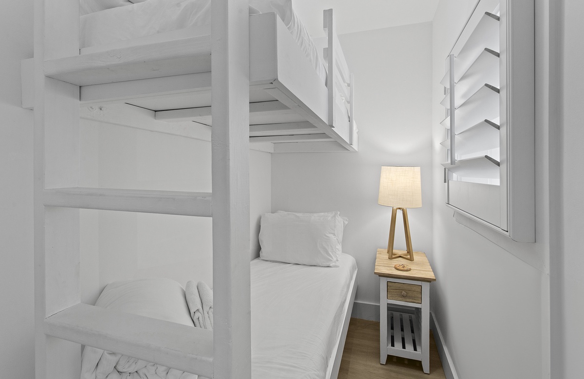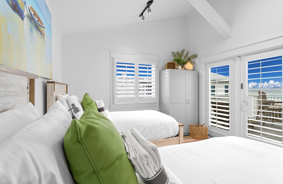 Fourth Floor: Guest Bedroom with Two Twin Beds and a Twin Bunk Nook + Walk-In Shower and Balcony Access.