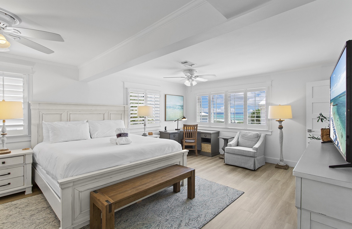 The Primary Bedroom spans the entire third level. It includes a king-size bed, cream-colored furnishings, a flatscreen TV, a desk/workspace, sunny windows, and a private bath. A spacious Guest Suite occupies the top floor. This family suite has two twin beds, twin bunk, kitchenette, and glass doors that lead to a furnished rooftop balcony.