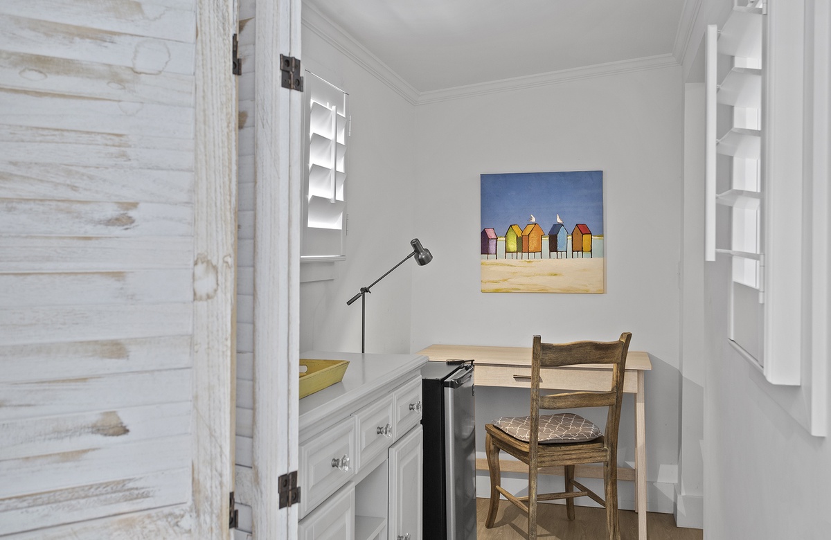 A cozy den on the first floor features a sofa, queen bunk, wall-mounted TV, a kitchenette, and a full-sized bathroom. From here, you can access a screened porch, which is furnished with a BBQ grill - perfect for cooking up a Southern-style coastal meal for the whole group. The covered porch also includes an outdoor shower and storage closet for all of your beach needs.