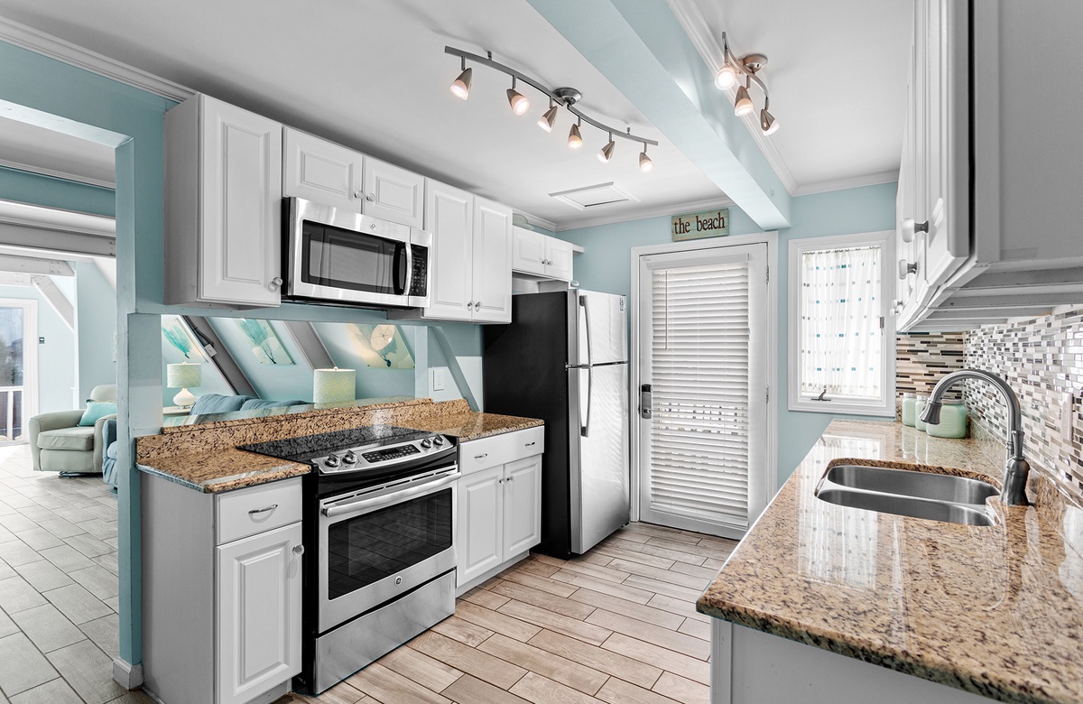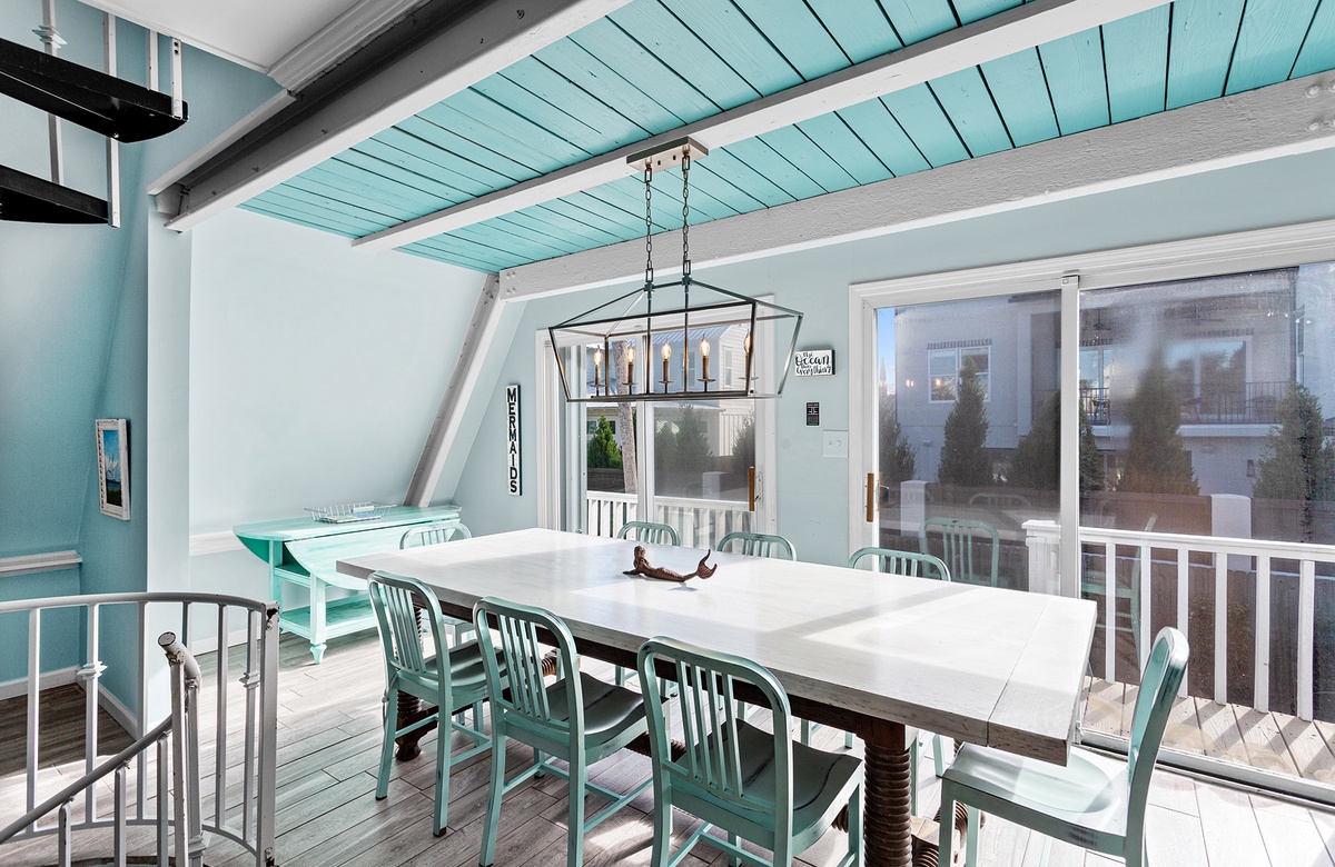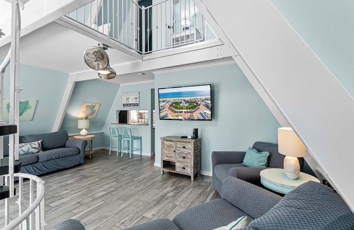 Inside, the first floor features a bright bunk room with two queen/twin bunks, sleeping six guests and opening directly onto the pool patio. A nearby bathroom with a walk-in shower also serves as a poolside powder room. The second-floor living area boasts vaulted ceilings, beach-washed hardwood tile flooring, and cozy seating around a large flat-screen TV. A rustic hardwood dining table seats eight, while the open kitchen, with stainless steel appliances and granite counters, inspires memorable meals. A king guest bedroom with cottage-style furnishings and a hall bath complete this level. The third floor houses a primary suite with a king-size bed, an ensuite bath, and access to a private rooftop sundeck, along with a cozy loft area featuring two twin beds.