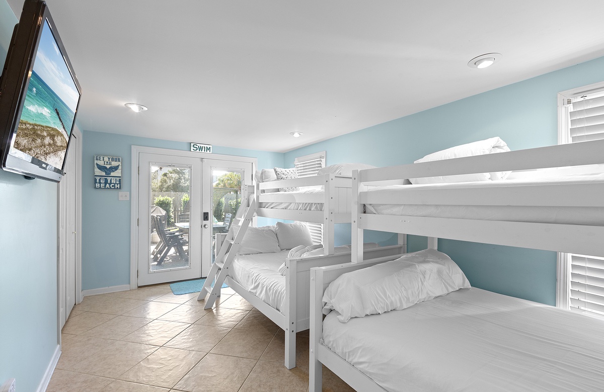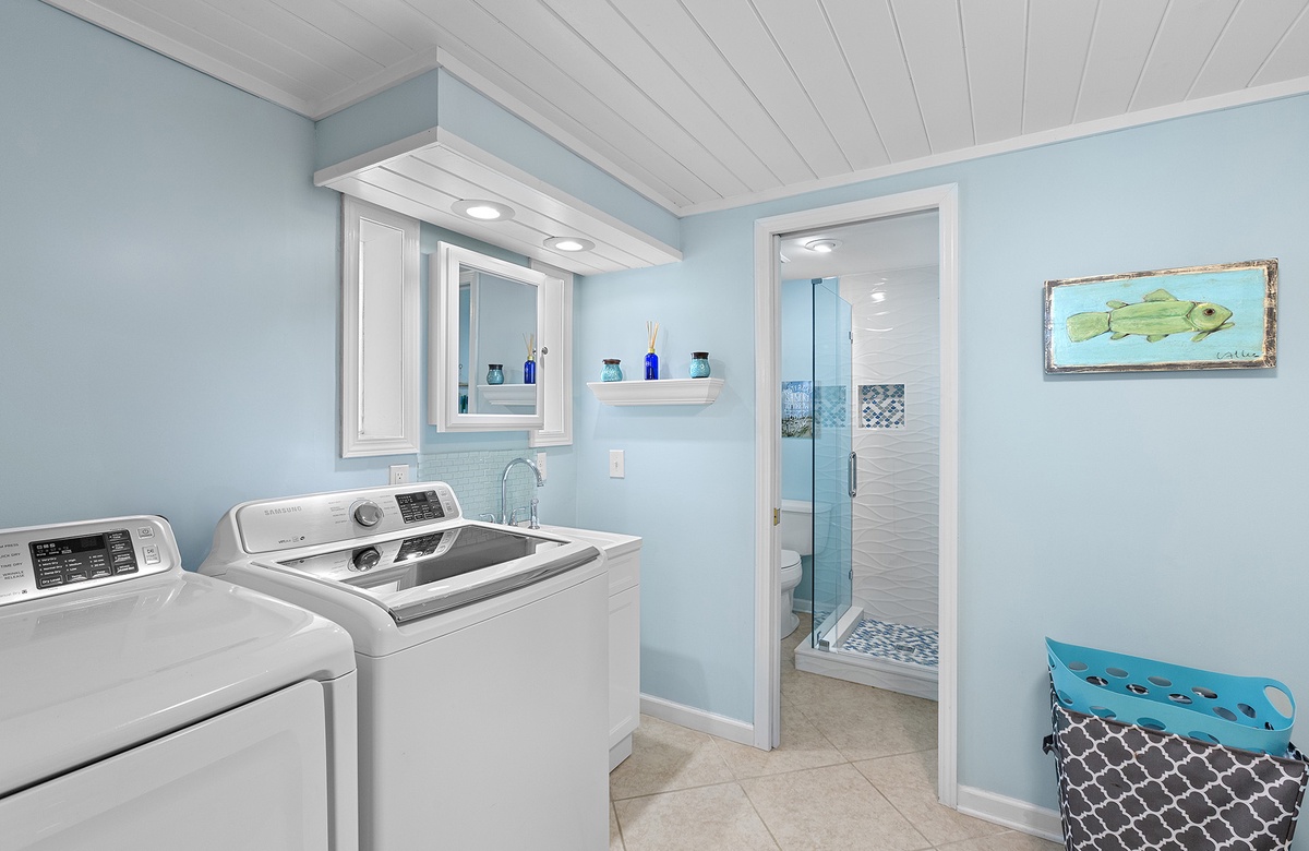 First Floor: Bunk Room with Two Queen/Twin Bunks, Shared Hall Bathroom with Walk-In-Shower, Laundry.