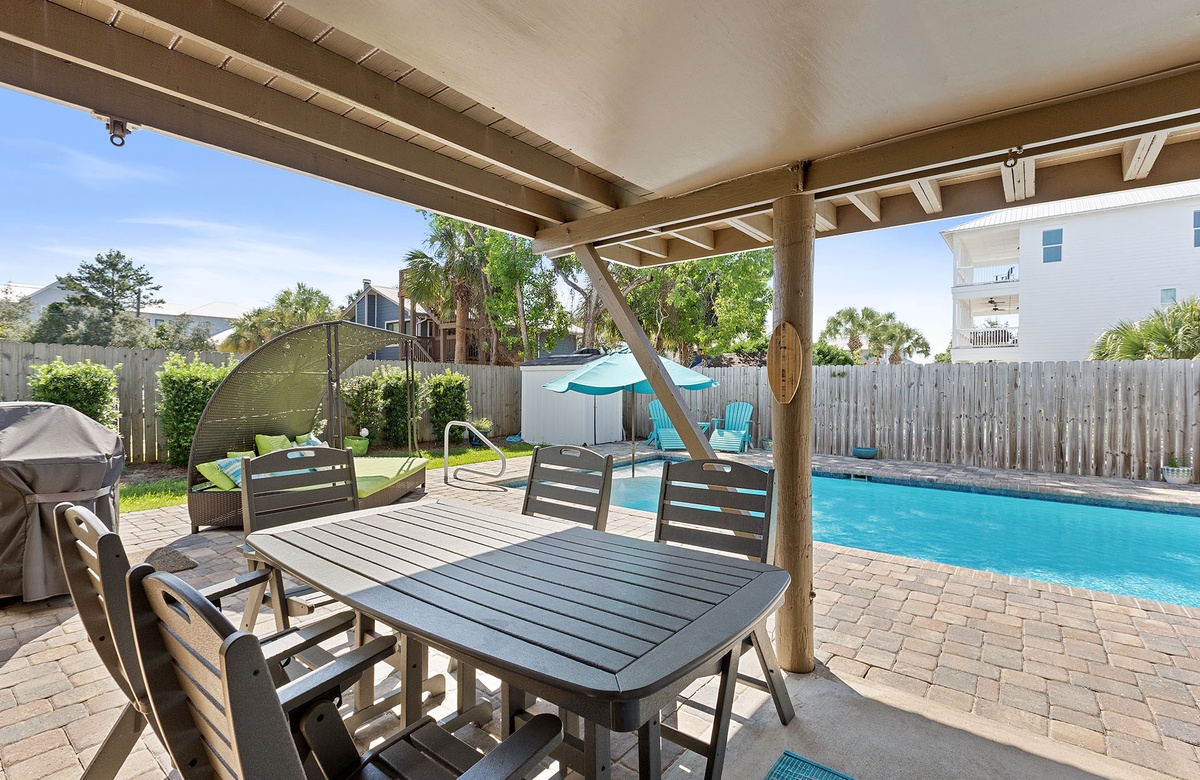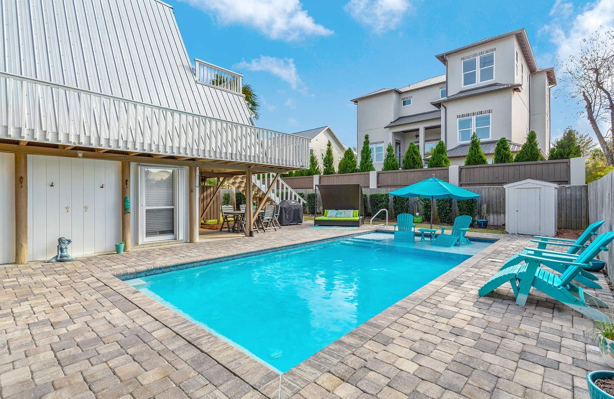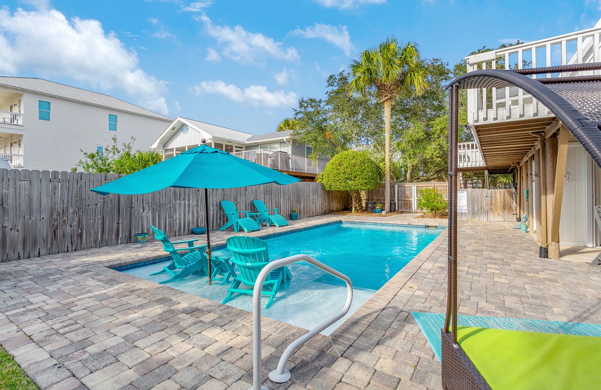 Welcome to Mermaid’s Retreat (formerly 30A Frame), a one-of-a-kind southern-style chalet in the heart of the Gulfview Heights community of Santa Rosa Beach. This pet-friendly, three-bedroom vacation home accommodates up to ten guests and offers the perfect blend of vintage charm and modern comfort. Its iconic white A-frame design features a wraparound balcony with cushioned rocking chairs where you can enjoy the coastal breeze. Down below, a wood bench swing under a majestic Live Oak provides a peaceful spot to relax, while the backyard’s paver patio surrounds a sparkling private pool, complete with in-water seating for soaking up the sun.