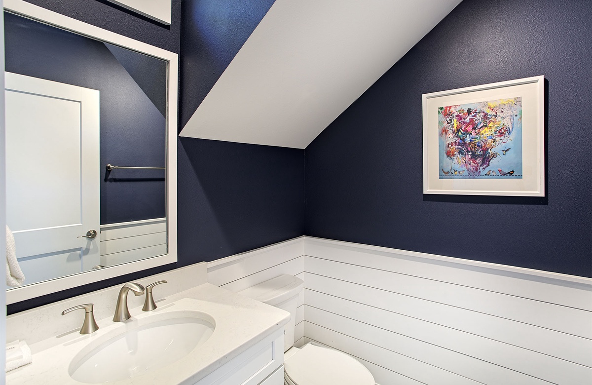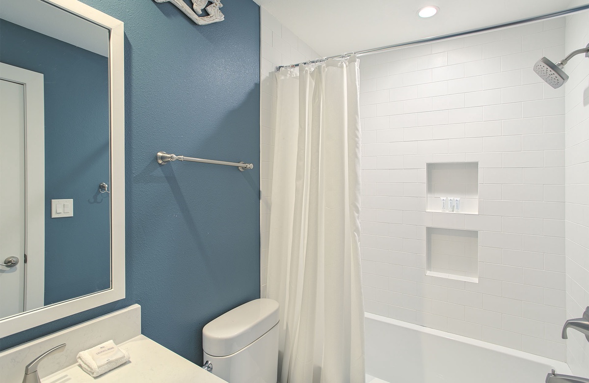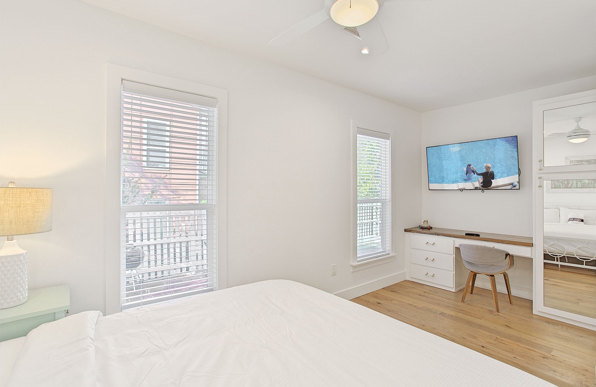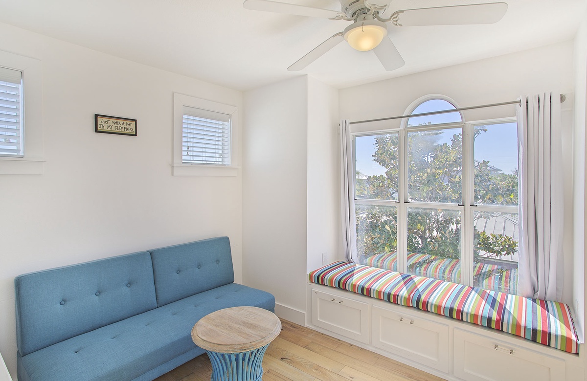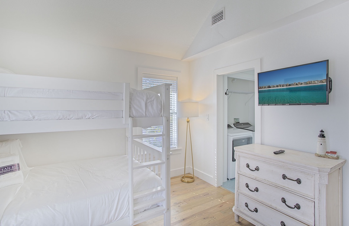 In addition to the great room, the first level of this nautical home also houses the master suite. This master bedroom includes a king-size bed, dedicated workspace, wall-mounted smart TV (live TV not provided), and an en-suite bath. Two guest bedrooms are located on the second level. One bedroom has a queen-size bed, a smart TV (live TV not provided), sunny windows, and a full private bath. The other bedroom is great for the kids in the group, as it has two full bunks and access to a sunny balcony that is furnished with rocking chairs. The kids will also love the bonus loft on the third level, which features a cozy couch and rooftop deck.