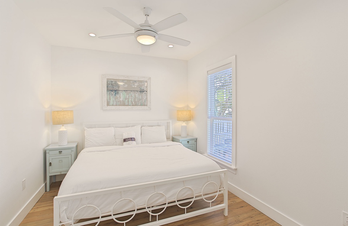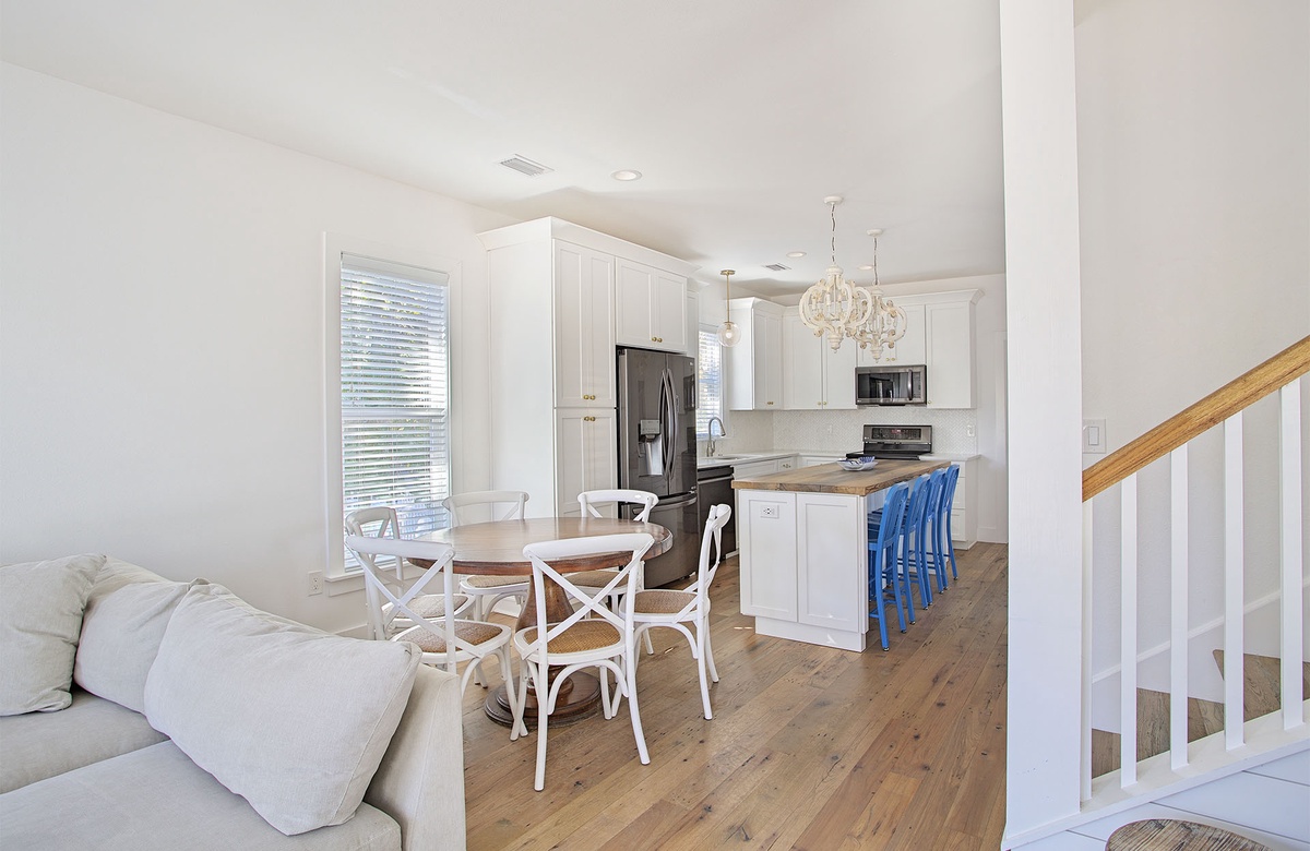 Periwinkle is in its own slice of heaven within a coastal paradise. Tropical plants surround the property, and the home's brilliant blue exterior and white trim radiate laidback coastal vibes. A breezy front porch invites you to come in, kick off your shoes, and stay awhile. Upon entering, guests are greeted with an open floor plan and large windows that brighten the space with natural sunlight. Honey-toned floors add to the spacious and welcoming atmosphere. The living room features a white wraparound couch and two blue armchairs surrounding a hardwood drink table that face a wall-mounted smart TV (live TV not provided). It's a cozy spot for casual conversation or catching the big game with your fellow guests. A dining area with a round table and six chairs sit next to the open kitchen. The kitchen has custom white cabinetry, stainless steel appliances, and an island with stool seating that doubles as a breakfast bar. From this level, guests can also access the backyard, which has a sundeck and swimming pool. Outdoor furniture and a grill ensure vacationers can enjoy fun, poolside meals, and refreshing drinks in this private oasis.